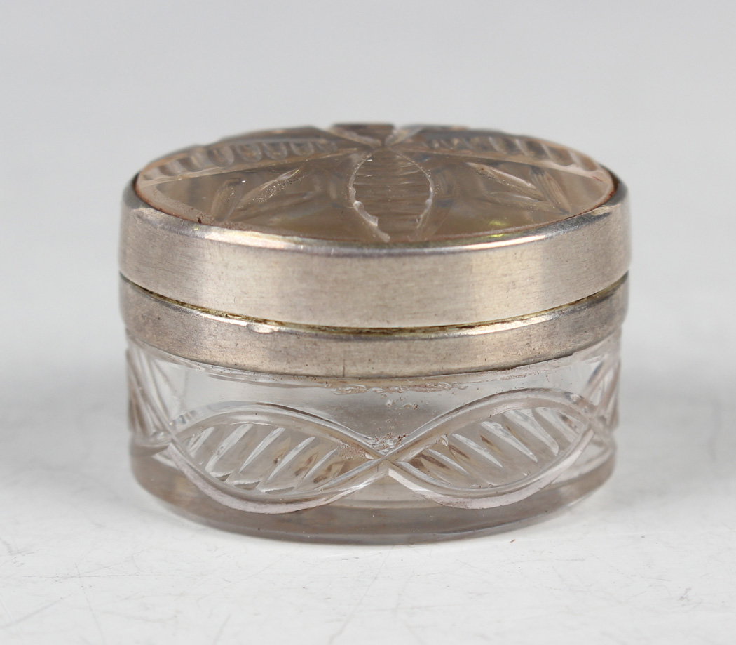 A Continental silver and silver gilt mounted cut glass vinaigrette, the hinged lid decorated with four petals revealing a pierced hinged grille, height 2cm.