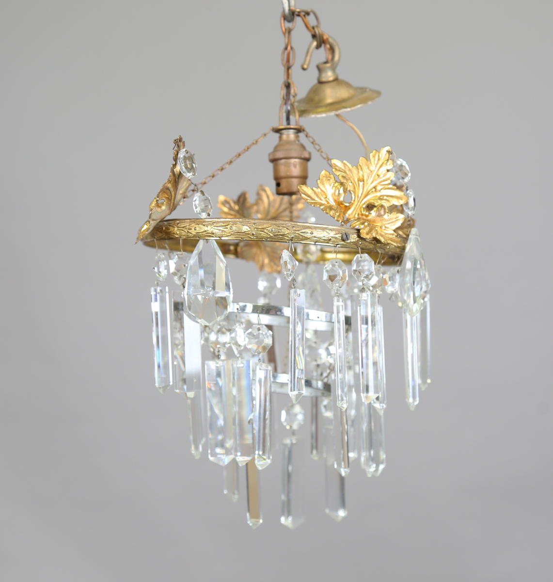 A group of seven 20th century gilt metal and cut glass chandeliers, largest diameter 21cm.