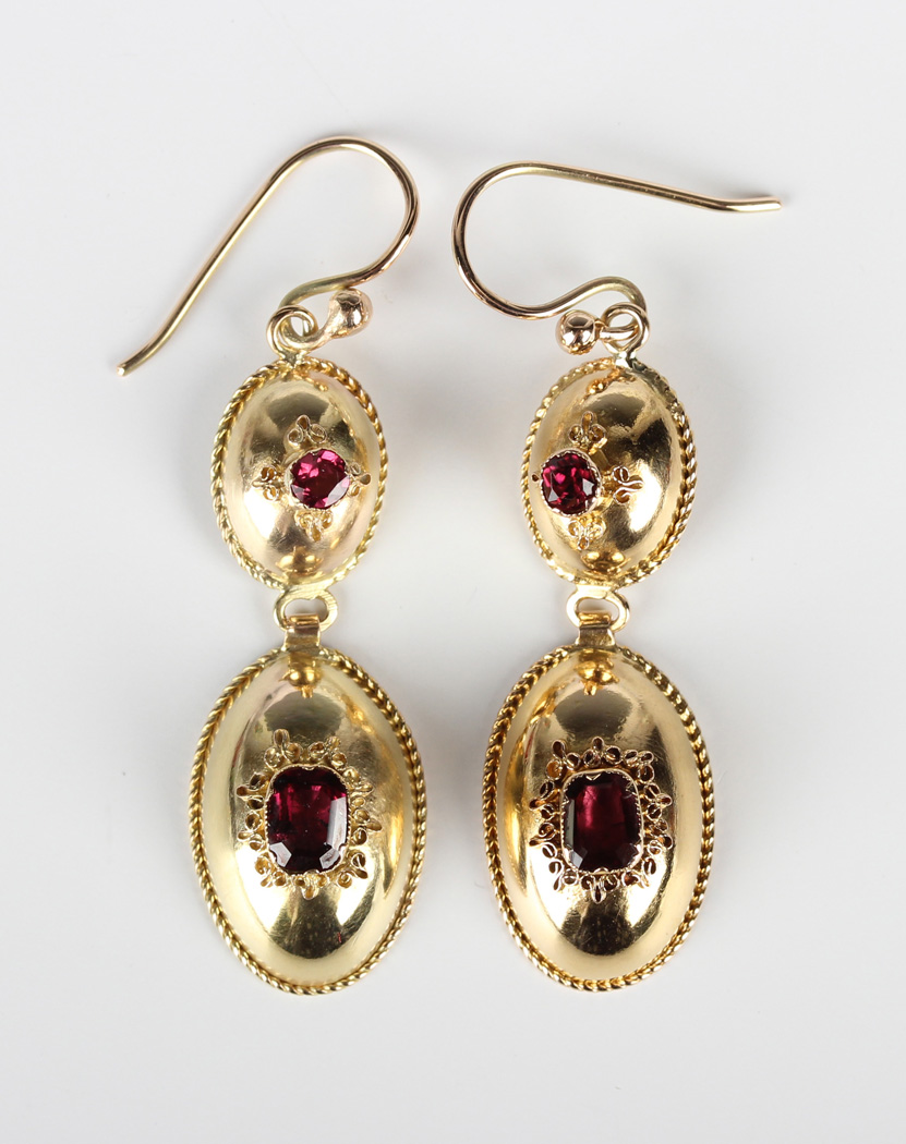 A pair of gold and garnet pendant earrings, each oval drop mounted with a step cut garnet within a filigree wirework and ropetwist surround, with a similar single stone garnet set oval top, with wire fittings, unmarked, weight 2.9g, length 4.3cm.