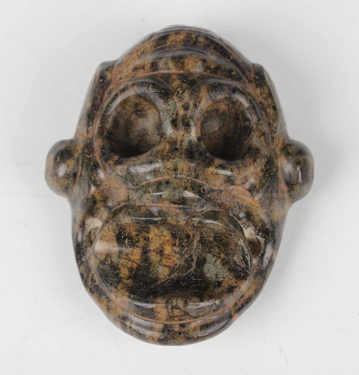 A pre-Columbian Taino style carved varicoloured hardstone human/monkey transformation mask, possibly 1000-1500 AD, bearing collector's label to reverse, height 9cm, width 7.7cm. Provenance: from the estate of a West Sussex collector.