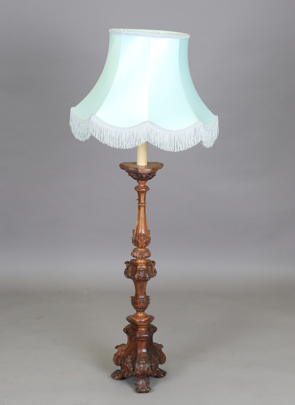 A 19th century French walnut table lamp of acanthus carved form, on a triform base, height 92cm, fitted with a shade.