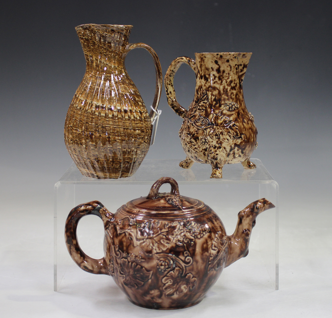 A Whieldon type creamware jug, circa 1770, of low-bellied form raised on tripod feet, sprigged with fruiting vine beneath a speckled brown tortoiseshell glaze, height 11.5cm, together with a similar teapot and cover and a fluted agate ware jug, height 14cm (minor faults and restoration).