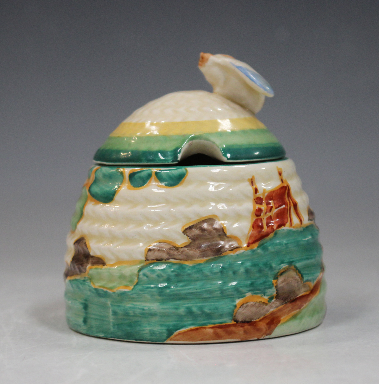 A Clarice Cliff Fantasque Secrets pattern beehive honeypot and cover, black Newport Pottery mark to base, height 8cm.