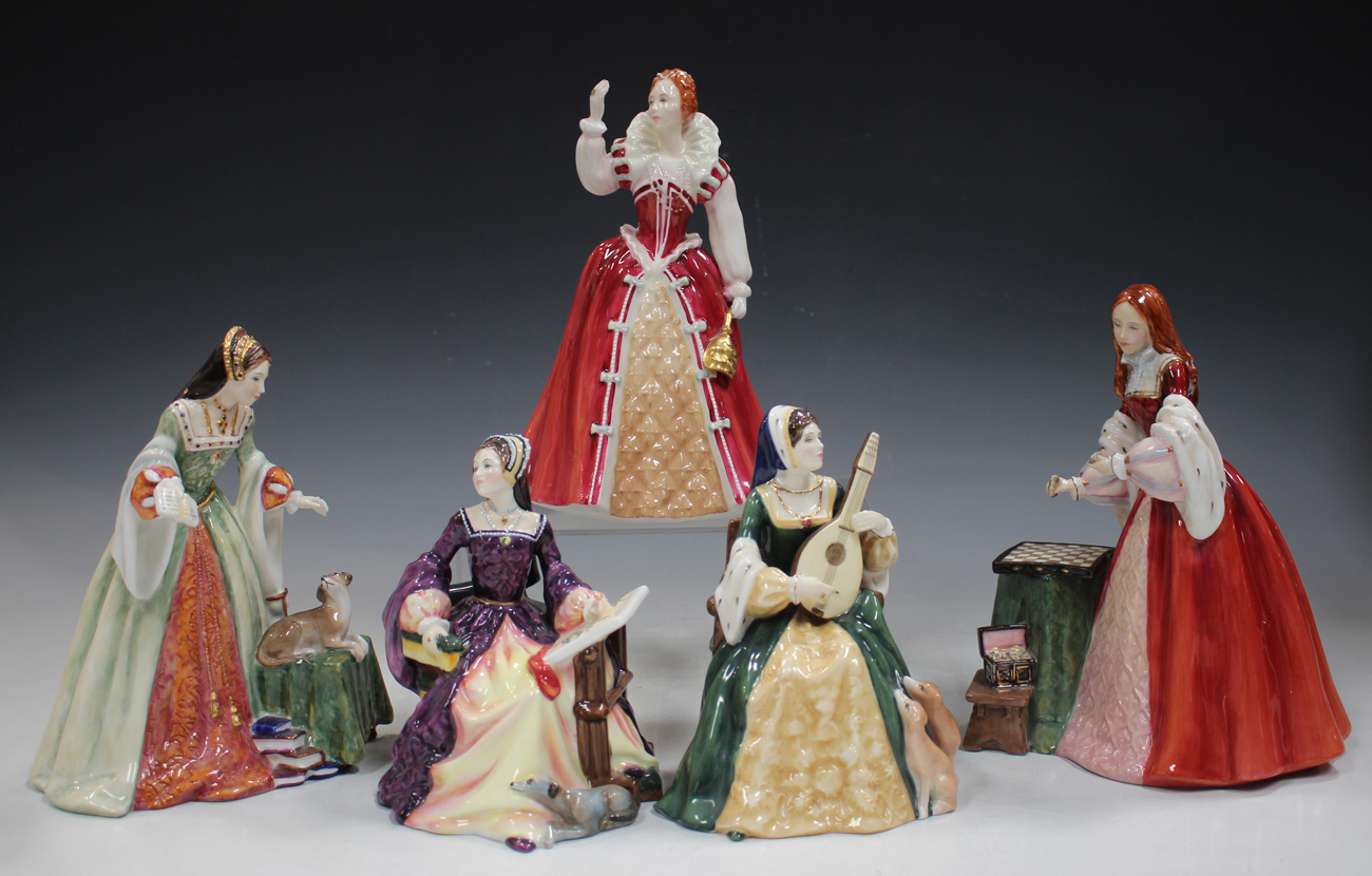 Five Royal Doulton limited edition figures, comprising Lady Jane Grey, HN3680, No. 1849 of 5000, Princess Elizabeth, HN3682, No. 955 of 5000, Margaret Tudor, HN3838, No. 531 of 5000, Mary Tudor, HN3834, No. 650 of 5000, and Queen Elizabeth I, HN3099, No. 2 of 5000.