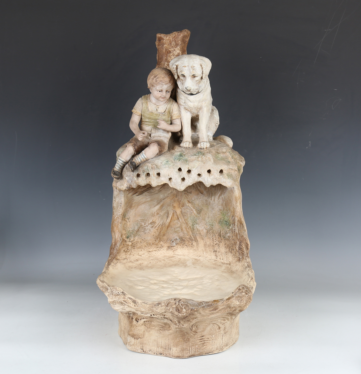 A large Johann Maresch pottery fish bowl centrepiece, circa 1900, designed by August Otto, modelled as a boy and his dog seated on a naturalistic mount before a tree stump, overlooking a circular naturalistic hollow, impressed mark to base with numerals '9599', height 60cm (lacking glass bowl).
