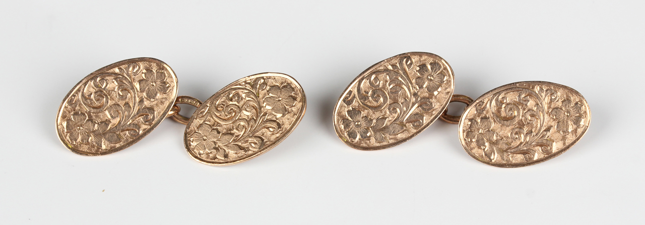 A pair of late Victorian 9ct gold oval cufflinks with floral and foliate engraved decoration, Birmingham 1897, weight 8.1g, dimensions of each front 1.9cm x 1.2cm.