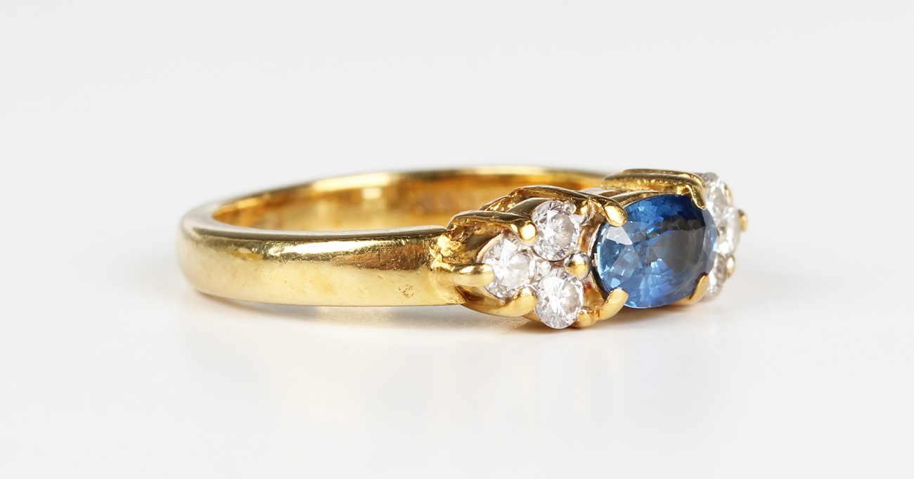An 18ct gold, sapphire and diamond ring, claw set with the oval cut sapphire between circular cut diamond set three stone sides, Birmingham 1998, weight 4.6g, ring size approx I1/2.