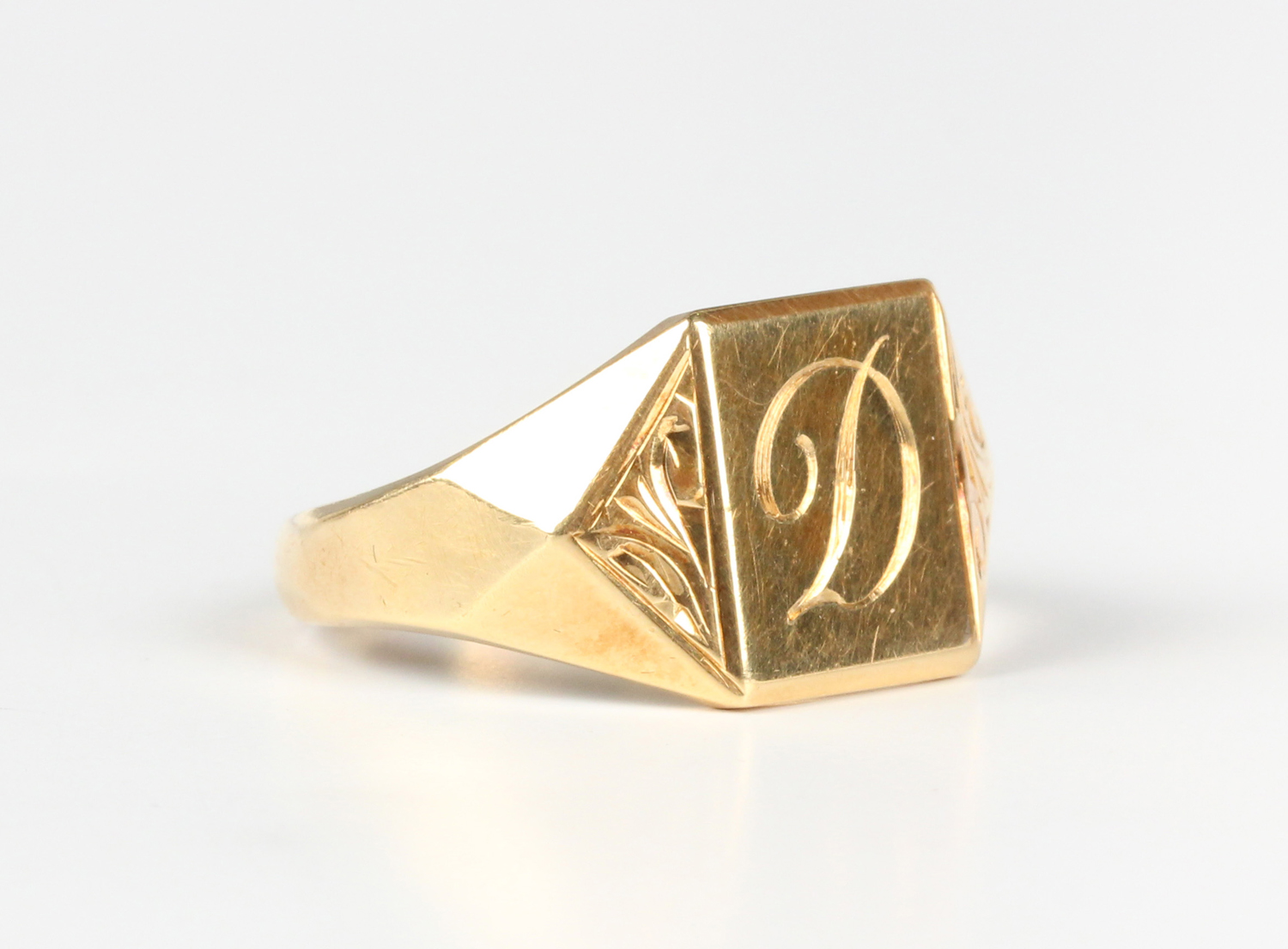 An 18ct gold rectangular signet ring, initial engraved with the letter 'D' between engraved triangular shaped shoulders, London 1960, weight 6.6g, ring size approx S1/2.