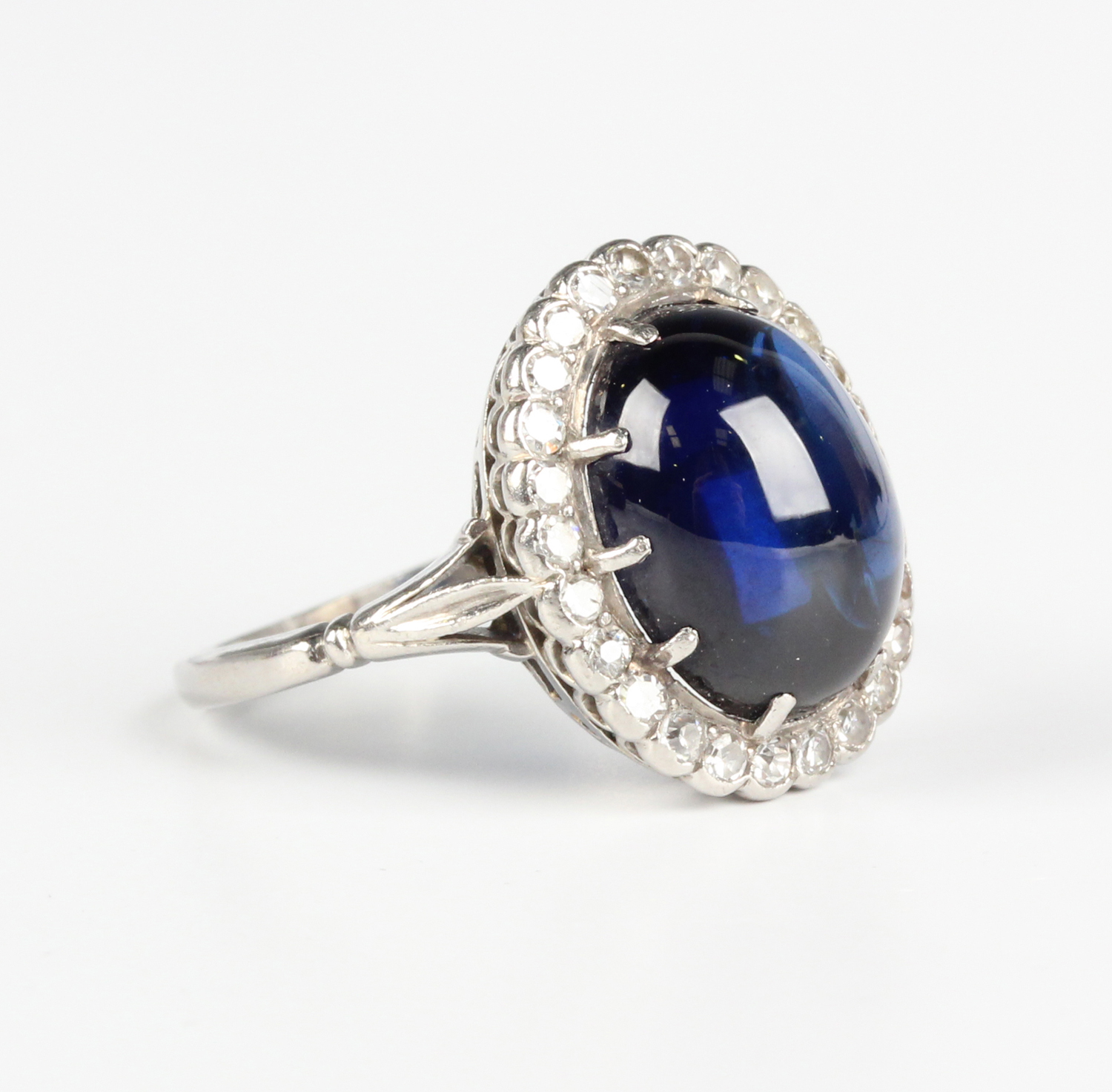 A white gold, treated cabochon sapphire and diamond oval cluster ring, claw set with the treated cabochon sapphire within a surround of circular cut diamonds between split shoulders, unmarked, ring size approx N1/2, with a case.