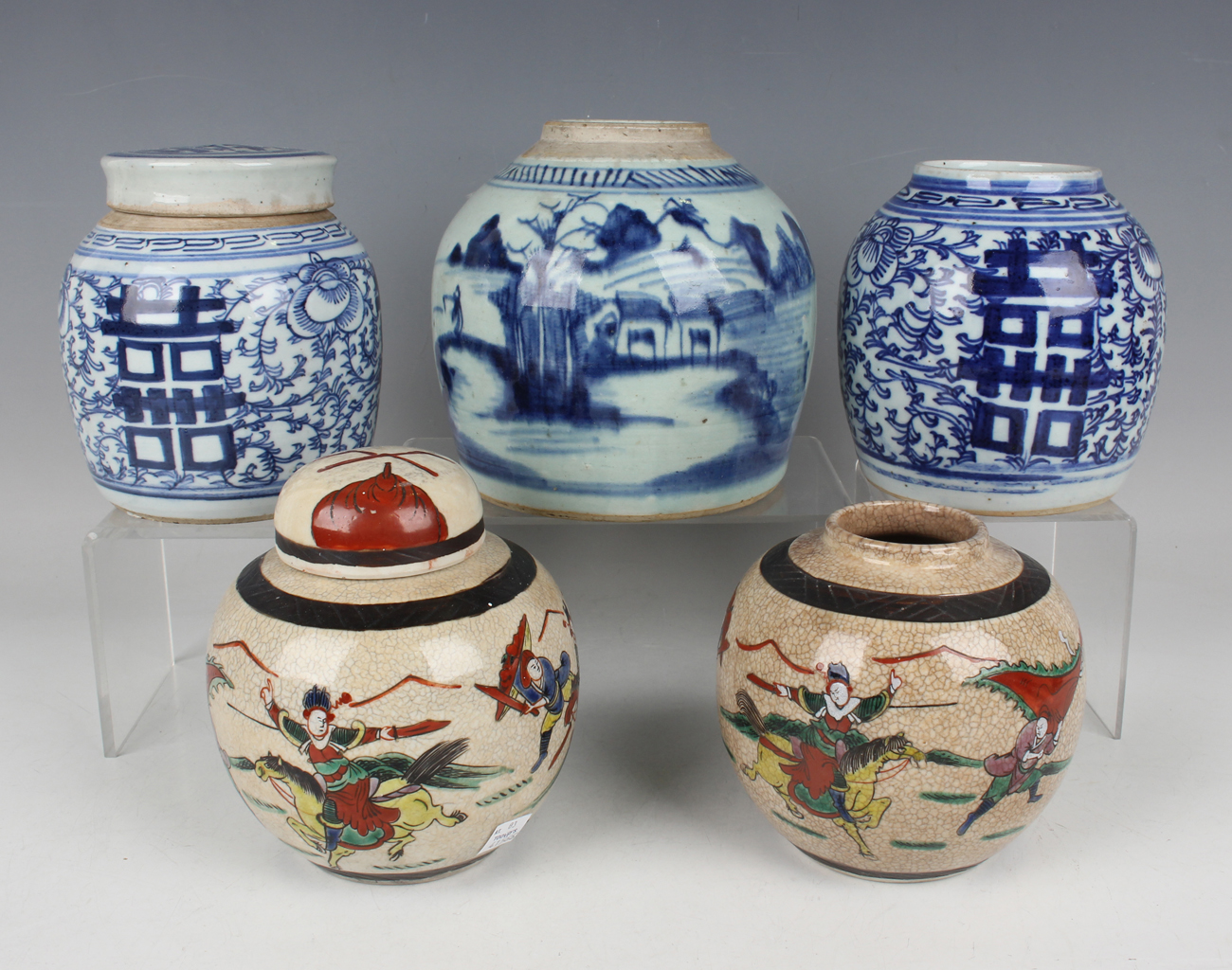 A Chinese provincial blue and white porcelain ginger jar, 19th century, painted with a coastal landscape, height 15.5cm, together with two other blue and white ginger jars and a cover (star crack to base of one), and two famille verte crackle glazed ginger jars and a cover.