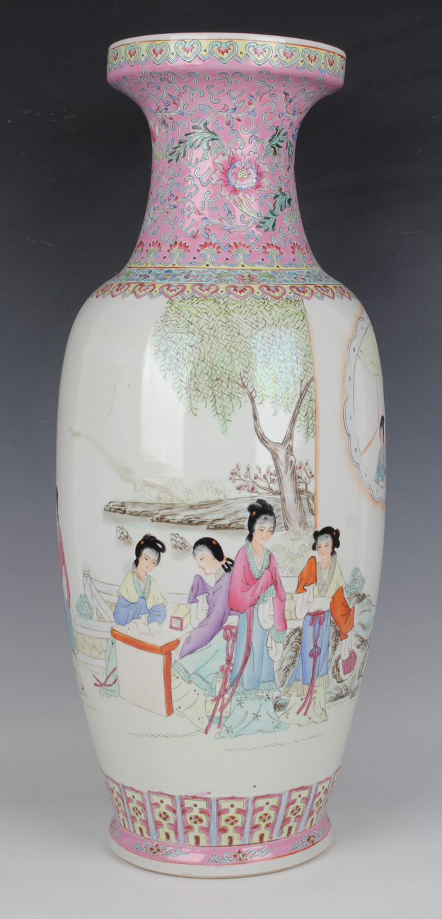 A Chinese famille rose porcelain vase, mid-20th century, the shouldered body painted with maidens in a landscape and two further maidens watching from a window, opposing lines of black text and red seals, beneath a flared neck decorated with lotus and scrolling tendrils on a pink ground, iron red printed seal mark to base, height 62cm.