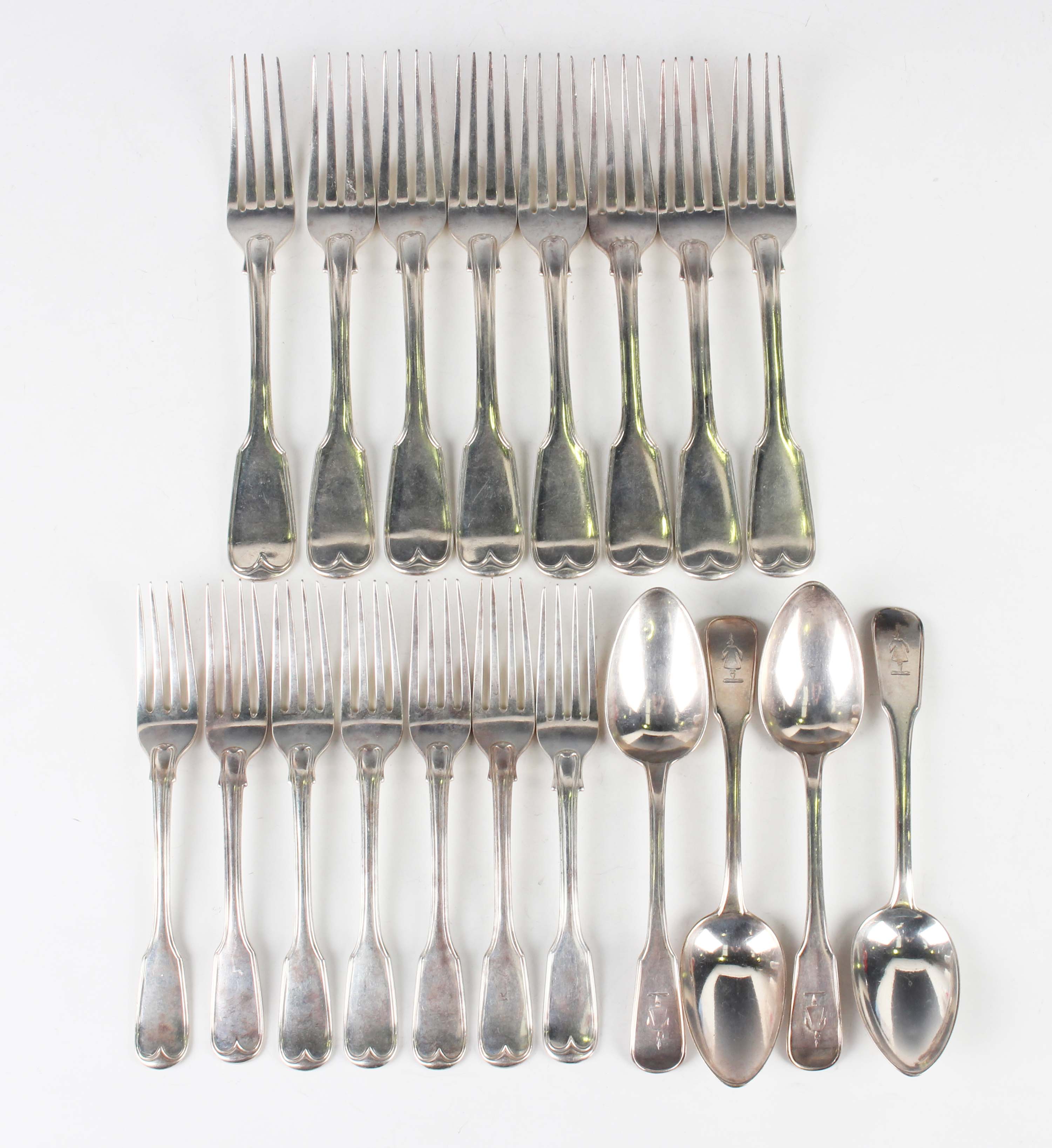 A George IV part canteen of silver Fiddle & Thread pattern cutlery, comprising eight table forks, seven dessert forks and four dessert spoons, London 1827 and 1828 by John, Henry & Charles Lias, together with six matched tablespoons, two dessert spoons and two teaspoons, various dates and makers, all engraved with a spear and tunic crest, total weight 1929.2g.