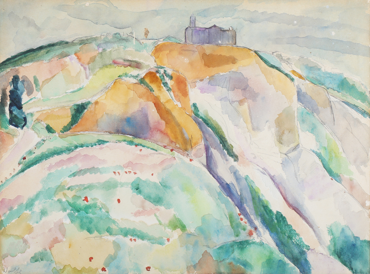 Edward Wolfe - Landscape with Large Building on a Hilltop, 20th century watercolour over pencil, signed, 30cm x 40cm, within a stained wood frame.