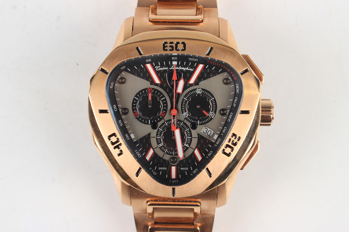 A Tonino Lamborghini gilt finished stainless steel cased gentleman's wristwatch, the signed triangular black and grey dial with three subsidiary dials and date aperture, the signed case back detailed 'RL5030D' and 'Serial No. MT6D042', the bracelet with foldover clasp, case width 4.8cm, cased, with instruction booklet, guarantee card and outer card box.