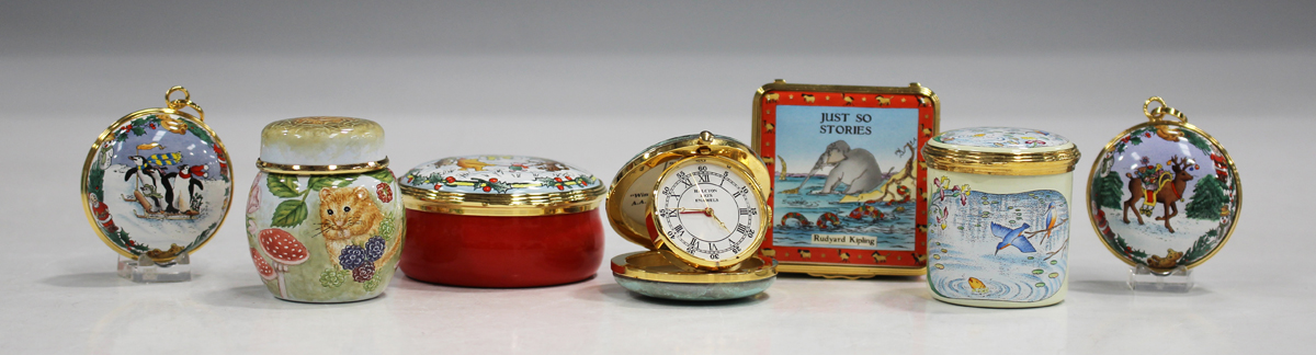 Six pieces of Halcyon Days Enamels, comprising a limited edition Rudyard Kipling box, No. 46 of 250, with certificate, a Winnie The Pooh Christmas box, No. 93 of 250, with certificate, a cylindrical box, a Pooh quartz travel alarm clock and two Christmas ornaments, together with an Elliot Hall Enamels limited edition miniature jar and cover, with certificate, all boxed.
