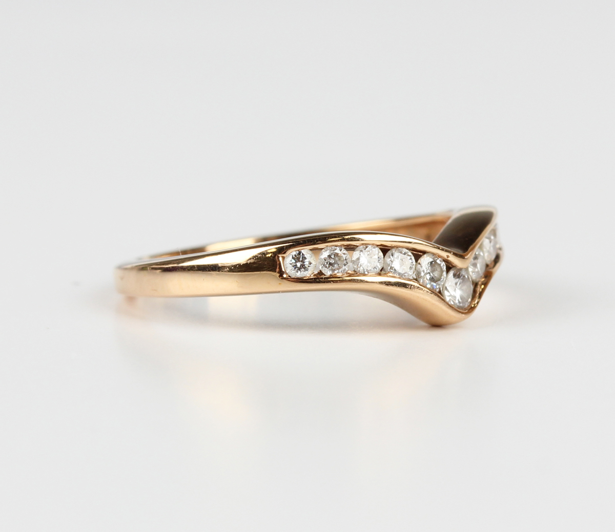 An 18ct gold and diamond ring in a 'V' shaped design, mounted with graduated circular cut diamonds, detailed '0.25', weight 2.6g, ring size approx K1/2.