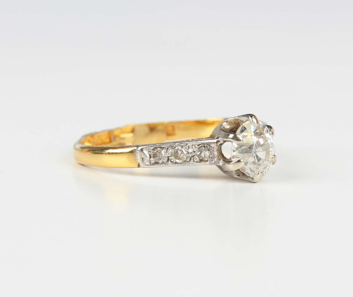 A gold and diamond ring, claw set with the principal cushion cut diamond between diamond set three stone shoulders, detailed '18ct', weight 2.9g, principal diamond weight approx 0.70-0.80ct, ring size approx Q.