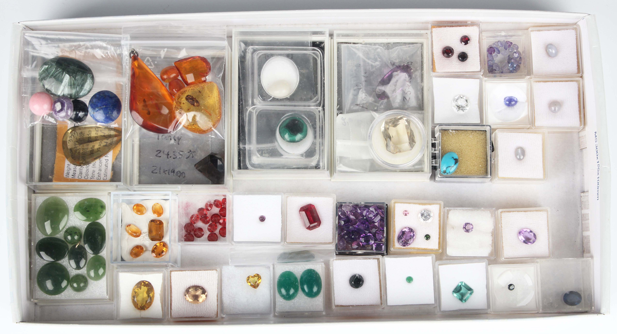 A collection of unmounted gemstones, including a large lemon citrine, dimensions approx 19.1mm x 16.4mm x 11.1mm, various other quartz varieties, three bluish-grey star sapphires, a cut cornered rectangular green fluorite, nephrite cabochons and a synthetic cut cornered rectangular ruby. Provenance: from the collection of the late Sheila Jeffery, West Sussex collector and geologist.
