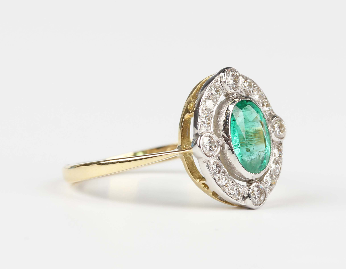 A gold, emerald and diamond ring, collet set with the oval cut emerald within an oval openwork surround, mounted with circular cut diamonds, detailed '18ct', weight 2.5g, ring size approx N.
