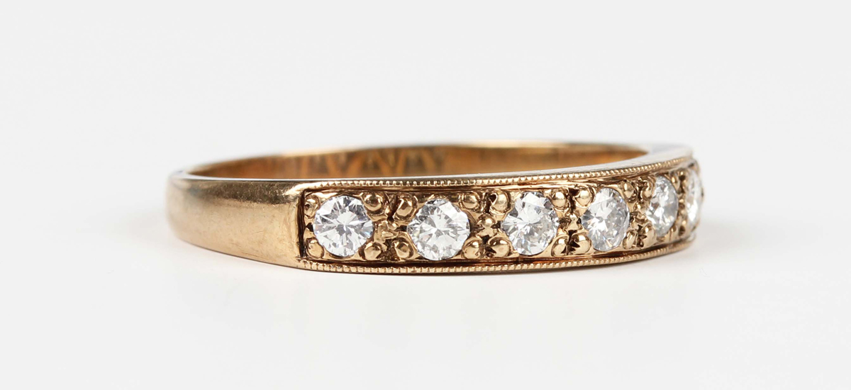 A gold and diamond seven stone half eternity ring, mounted with circular cut diamonds, indistinct mark, weight 3.3g, total diamond weight approx 0.60-0.70ct, ring size approx V1/2.