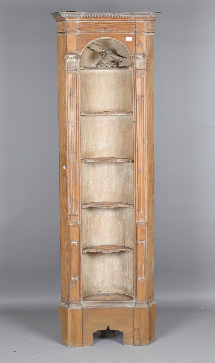 A late 19th/early 20th century Neoclassical Revival narrow pine barrel-back corner shelf, the arched niche with carved eagle surmount above five shaped shelves, height 215cm, width 65cm, depth 22cm. Provenance: from the principal contents of Stone House, Bolney, West Sussex.