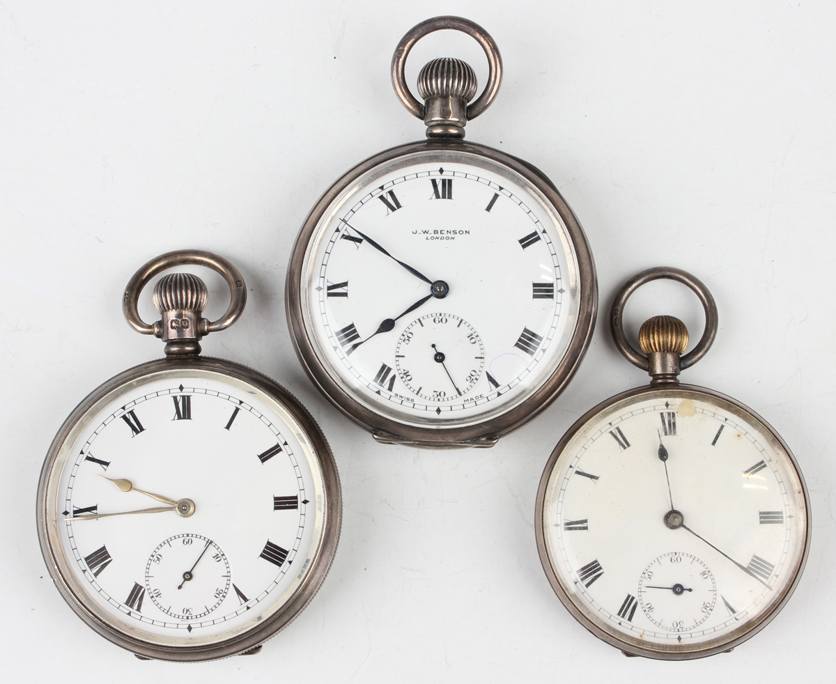 A J.W. Benson London silver cased keyless wind open-faced gentleman's pocket watch, the gilt jewelled movement detailed 'J.W. Benson Swiss made', the signed dial with Roman numerals, London 1940, case diameter 5cm, together with a silver cased keyless wind open-faced gentleman's pocket watch, the gilt jewelled lever movement detailed 'Moeris', Birmingham 1928, case diameter 4.9cm, and another silver cased keyless wind open-faced pocket watch, import mark London 1913, case diameter 4.5cm.