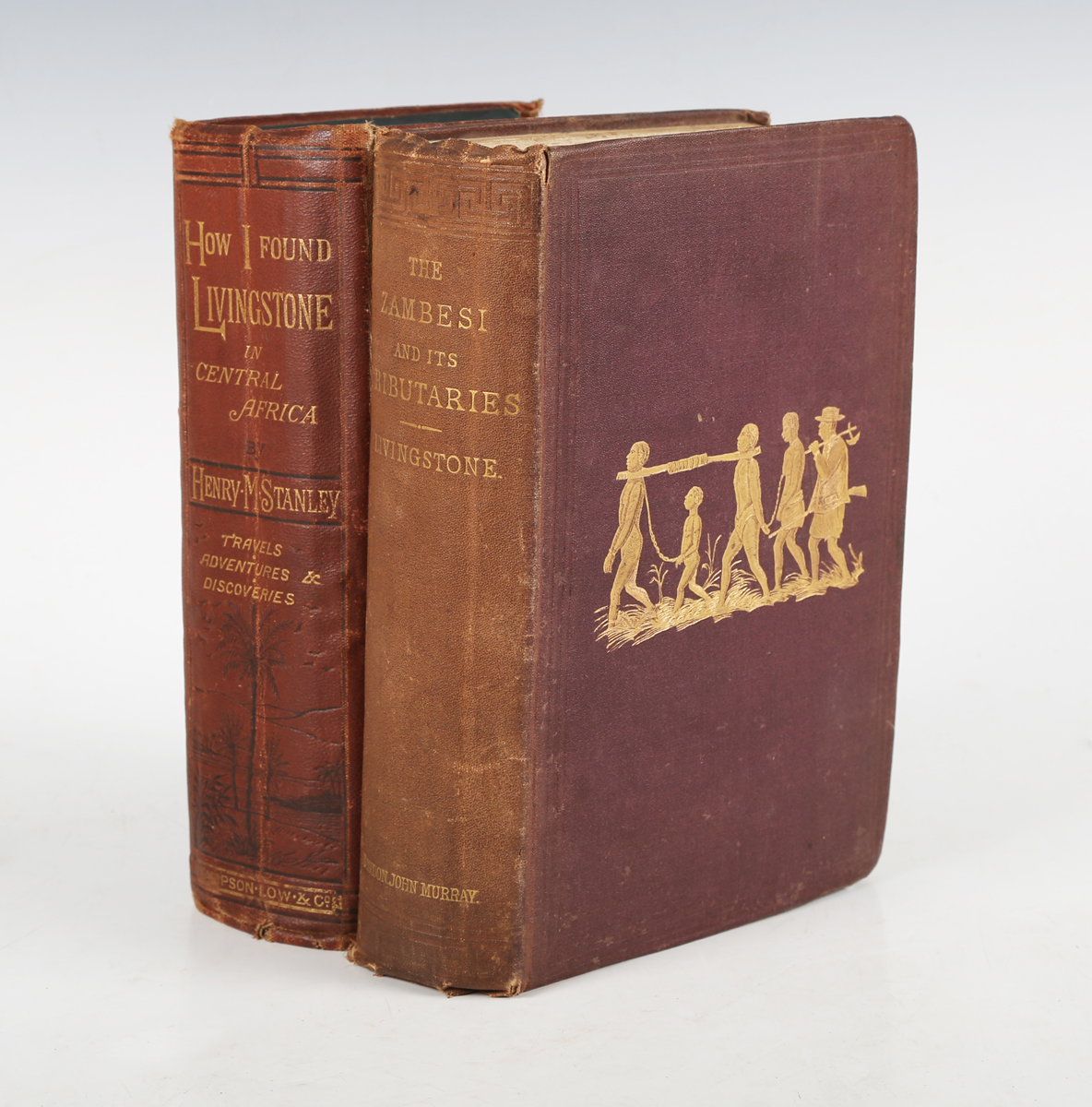 AFRICA. - Henry Morton STANLEY. How I Found Livingstone; Travels, Adventures, and Discoveries in Central Africa; including Four Months Residence with Dr. Livingstone. London: Sampson Low etc., 1872. First edition, 8vo (219 x 136mm.) Half-title, mounted photographic frontispiece, 5 maps including 4 folding, 28 plates, illustrations in the text, 8pp. publisher's advertisements to rear. (1 map with a six-inch closed tear, toning, occasional light spotting.) Original brown blind-stamped cloth (hinges weakened, joints rubbed). Provenance: Walter Beaton (ink inscribed to half-title); Andrew G. Beaton (ink inscribed to half-title). - And a further volume (David and Charles Livingstone's 'Narrative of an Expedition to the Zambesi and Its Tributaries', 1865, 8vo) (2).