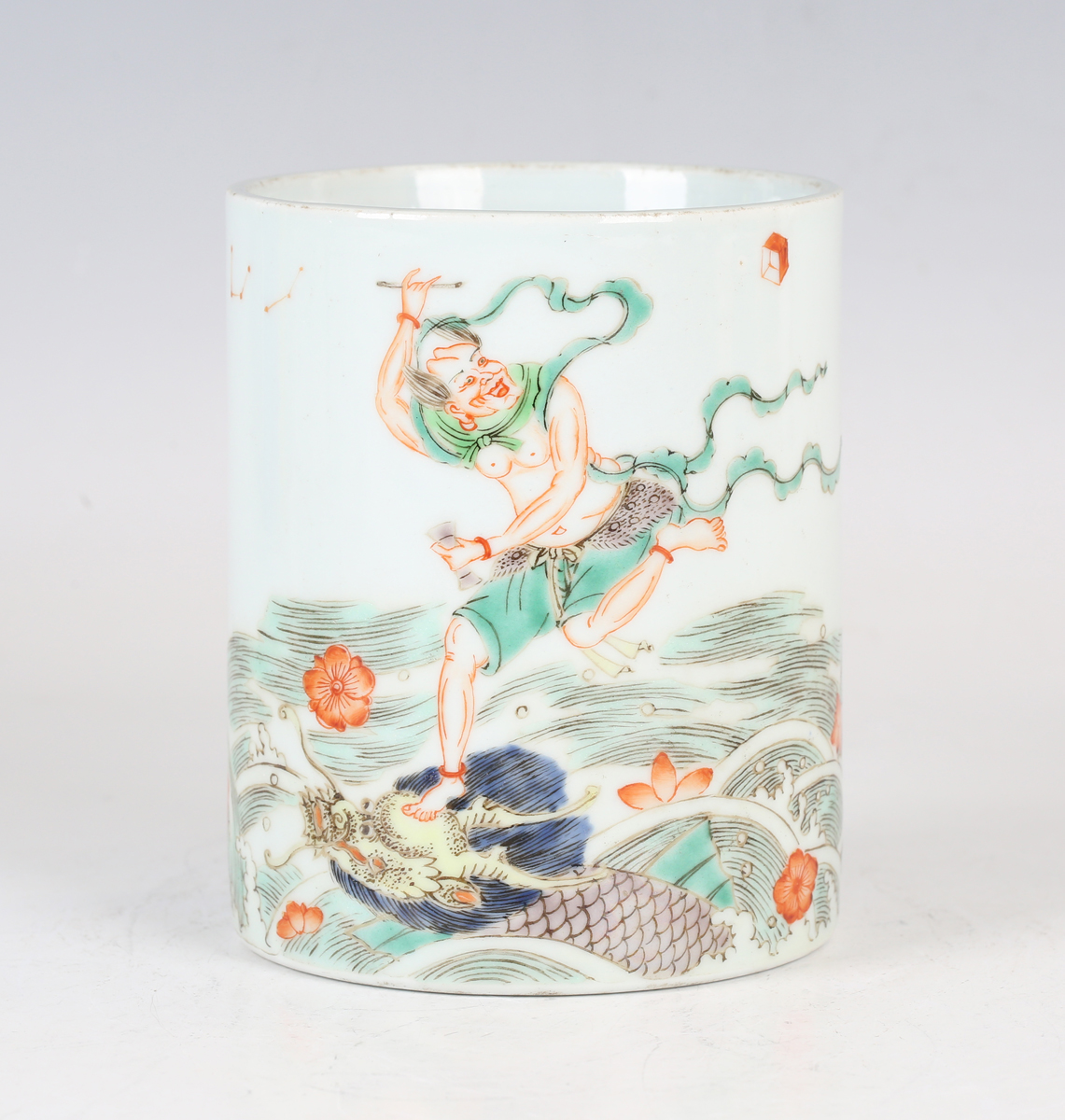 A Chinese famille verte porcelain brushpot, Kangxi style but later, of cylindrical form, the exterior painted with a figure standing on the head of a dragon amidst waves, height 12.5cm.