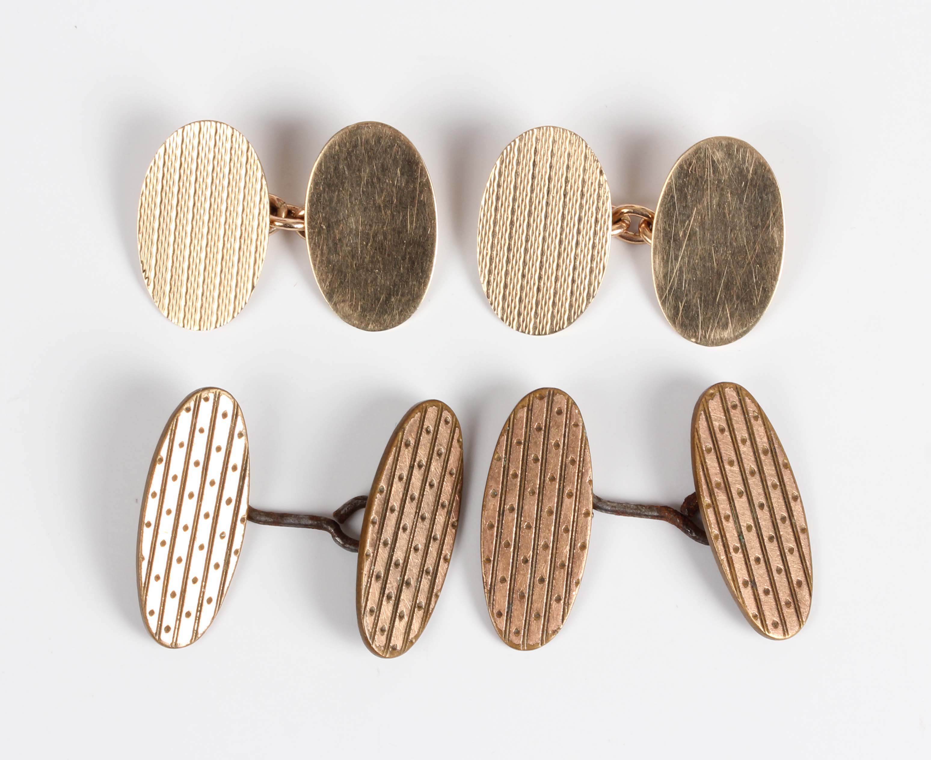 A pair of 9ct gold oval cufflinks, engine turned to one side, Birmingham 1972, weight 4.4g, dimensions of each front 1.8cm x 1.1cm, and a pair of gilt metal oval cufflinks.
