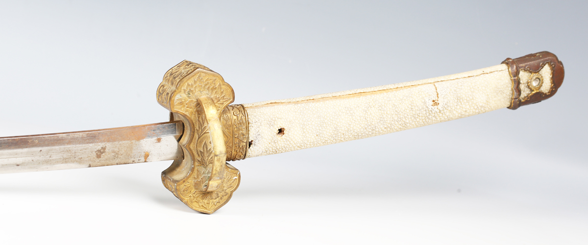 A 19th century and later Japanese katana with single-edged blade, overall blade length with fittings removed 79cm, the tang signed to both sides, probably later ill-fitted gilt metal box-form guard, decorated with foliate motifs, and fishskin grip, with lacquered and gilt metal mounted scabbard with foliate decoration.