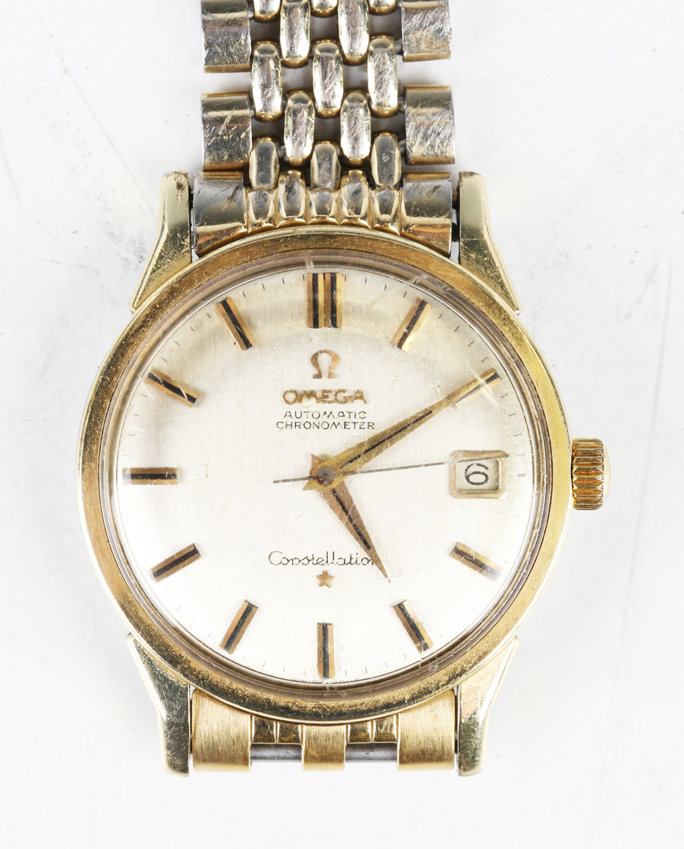 An Omega Constellation Automatic gilt metal fronted and steel backed gentleman's bracelet wristwatch, circa 1962, the signed jewelled 561 caliber movement numbered '19448987', the signed dial with gilt baton hour markers and date aperture, the signed case back interior detailed '14902 62 Sc', the link bracelet with signed foldover clasp, case diameter 3.4cm (missing observatory medallion to back of case).