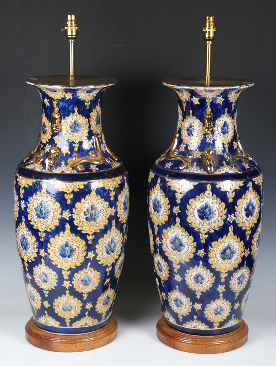 A pair of modern Chinese style porcelain vase table lamps, gilt decorated against a blue ground, on a wooden base, height 65cm.