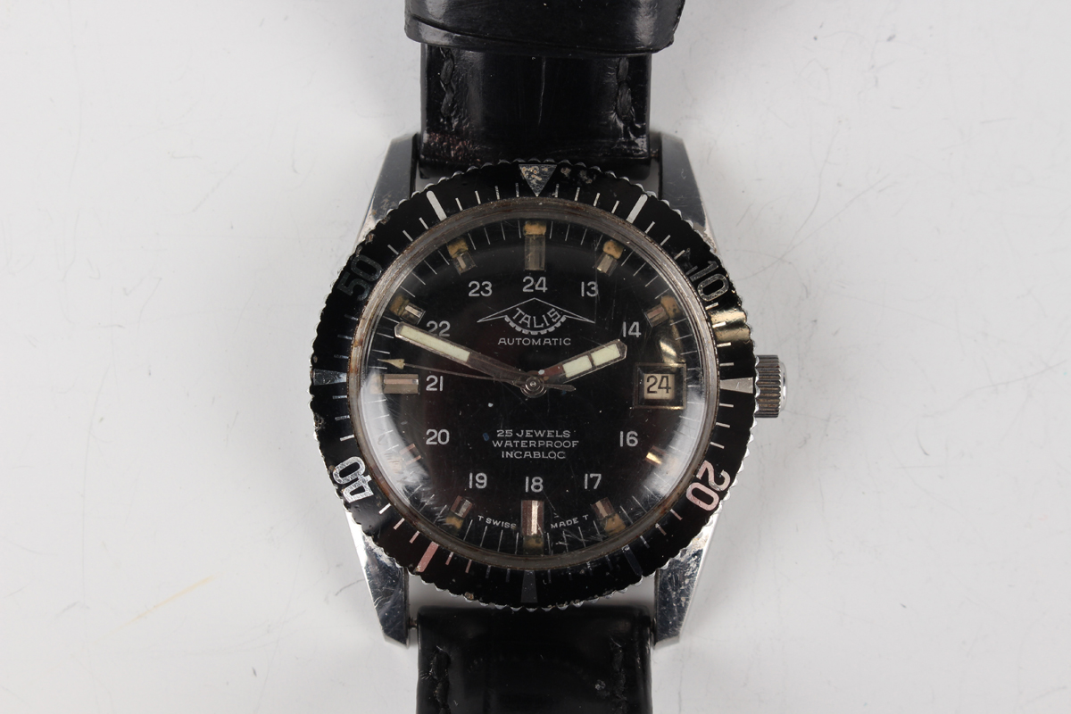 A Talis Automatic steel cased gentleman's wristwatch, the signed black dial with Arabic numerals to 24, date aperture, centre seconds and rotating bezel, case diameter 3.6cm, on a black leather strap.