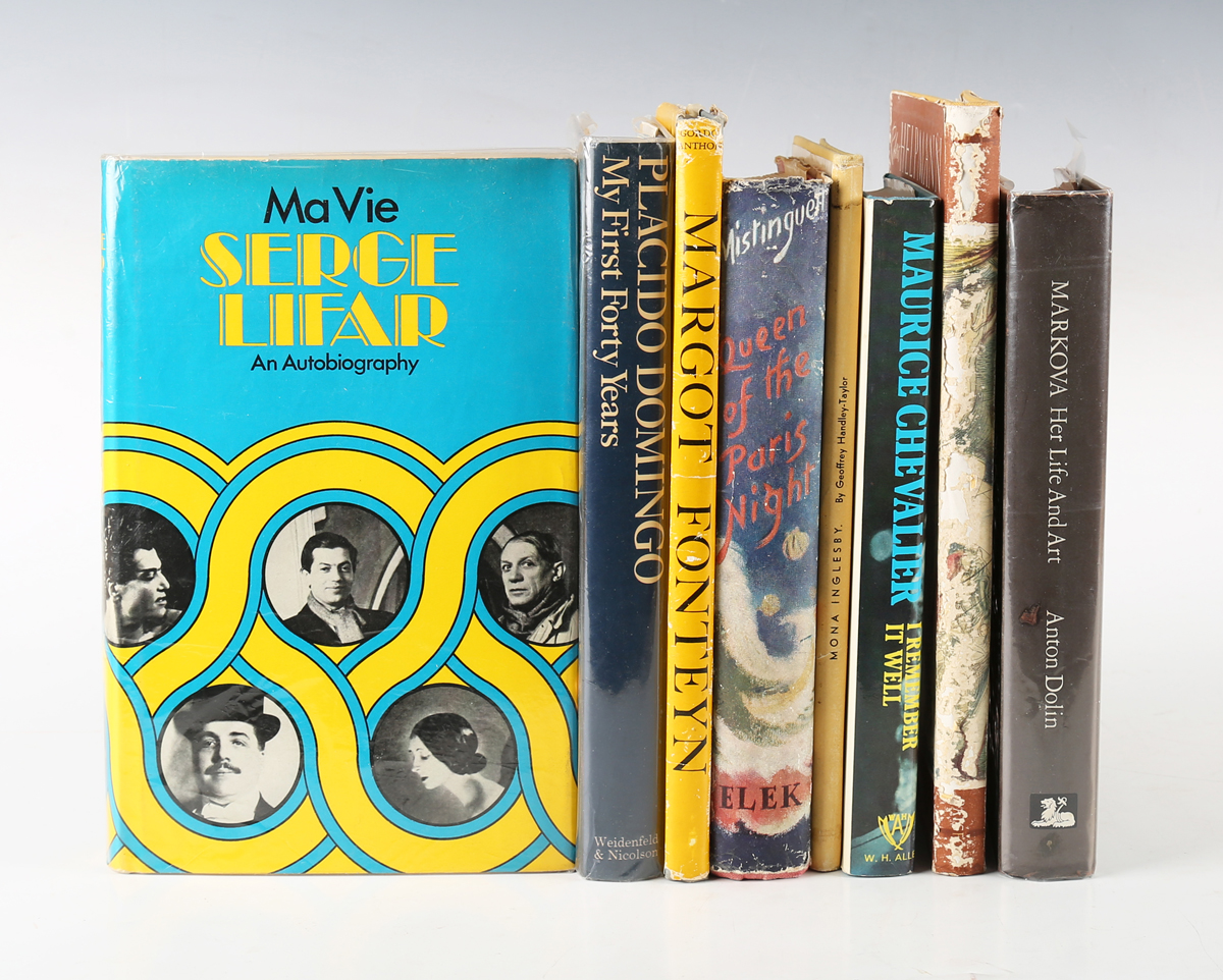 SIGNED BOOKS. - Serge LIFAR. Ma Vie. London: Hutchinson and Co., 1970. First edition, signed by the author to half-title, 8vo (228 x 141mm.) Numerous illustrations. (Mild toning.) Original cloth, dust-jacket (slight browning). Provenance: Harold Harris (ink inscription from Serge Lifar dated 'Covent Garden, 22/3/70'). - And a further twenty-three volumes relating to ballet or opera, all signed (including Placido Domingo's 'My First Forty Years', 1983, 8vo, and Gordon Anthony's 'Margot Fonteyn', signed by the author and Margot Fonteyn and Ninette de Valois, 1951, 8vo) (24).