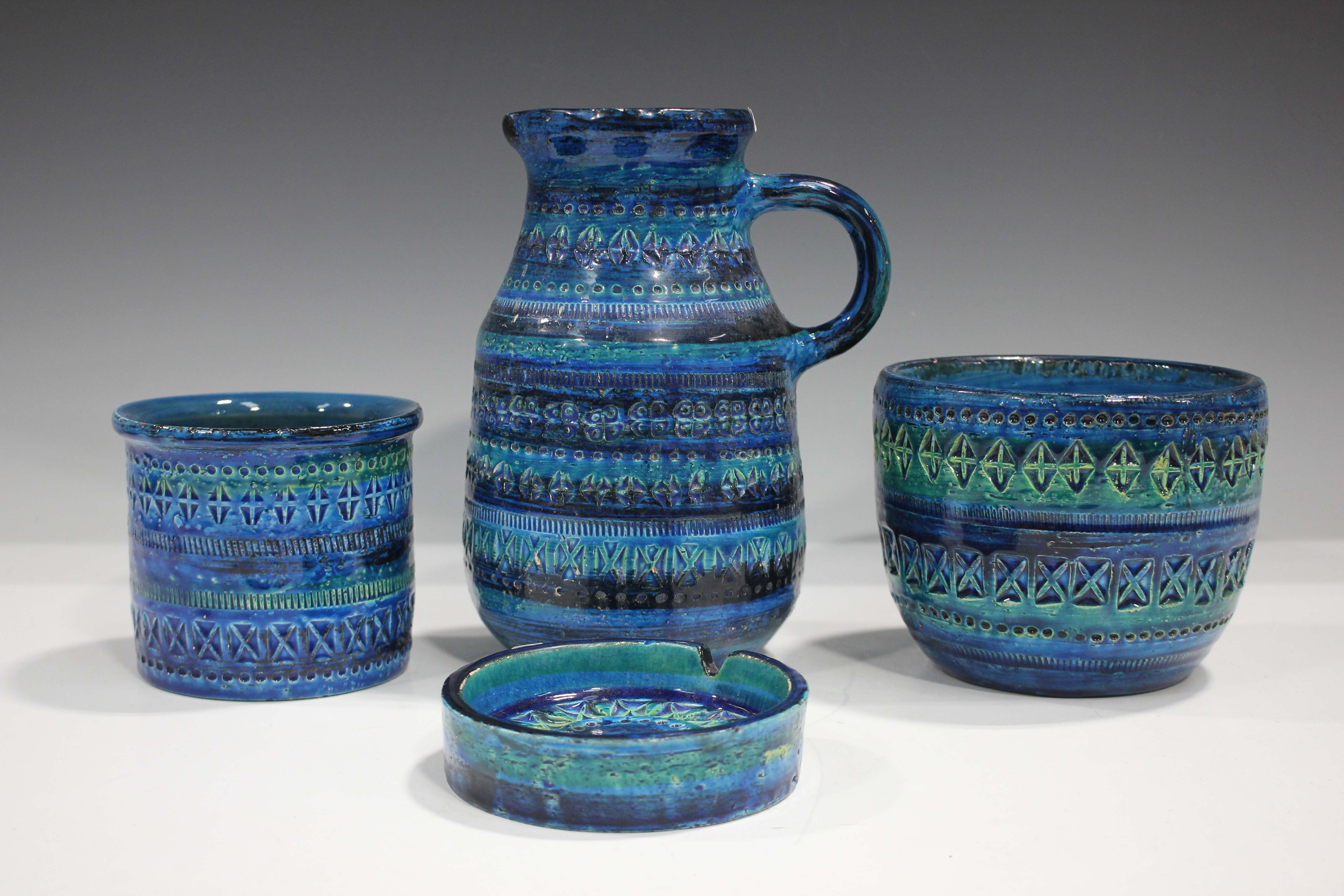Four pieces of Italian Bitossi Rimini Blu pottery, 1960s, designed by Aldo Londi, comprising a jug, height 22cm, two jardinières and an ashtray, some impressed and painted marks.