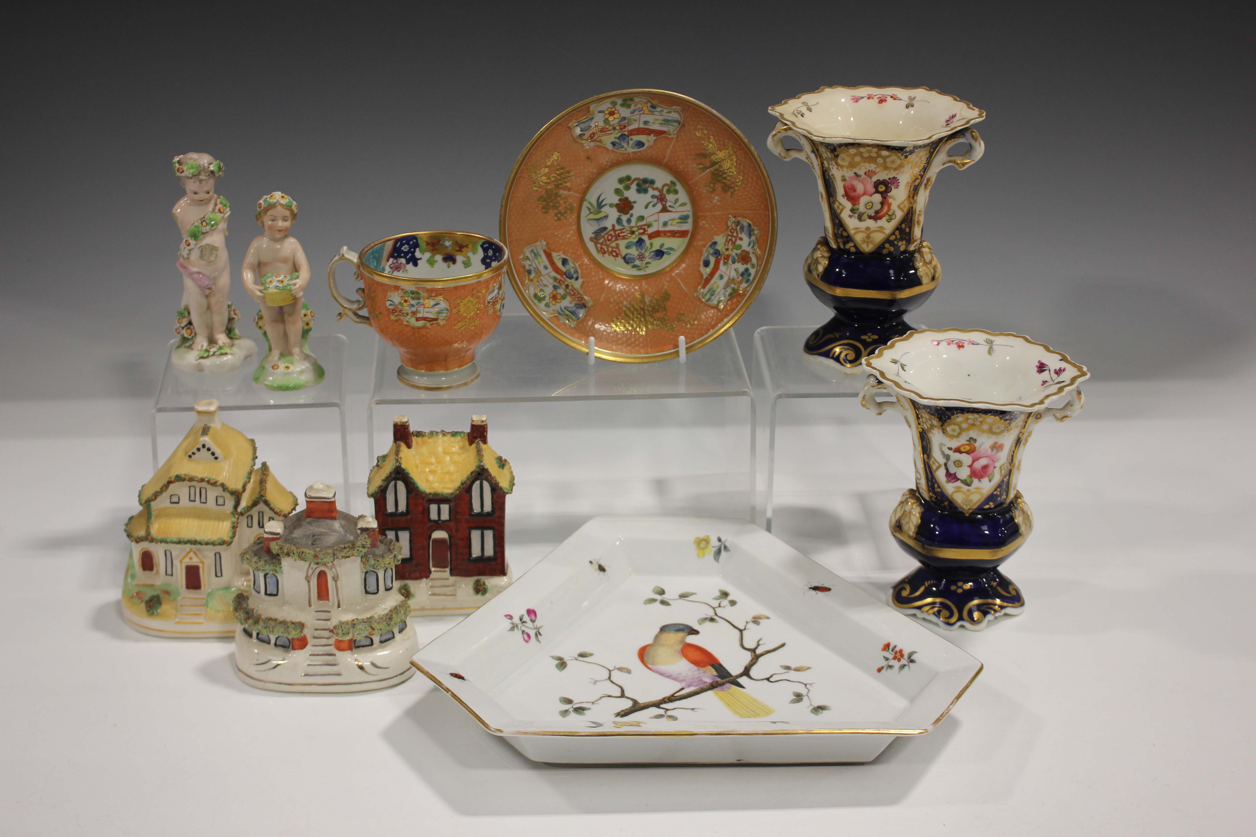 A C.J. Mason relief moulded ironstone cup and saucer, early 19th century, painted with reserved chinoiserie panels against an orange basketweave moulded ground, indistinct impressed mark to cup, together with a Berlin porcelain triangular shaped dish, painted with a bird, and a small group of other ceramics (faults).