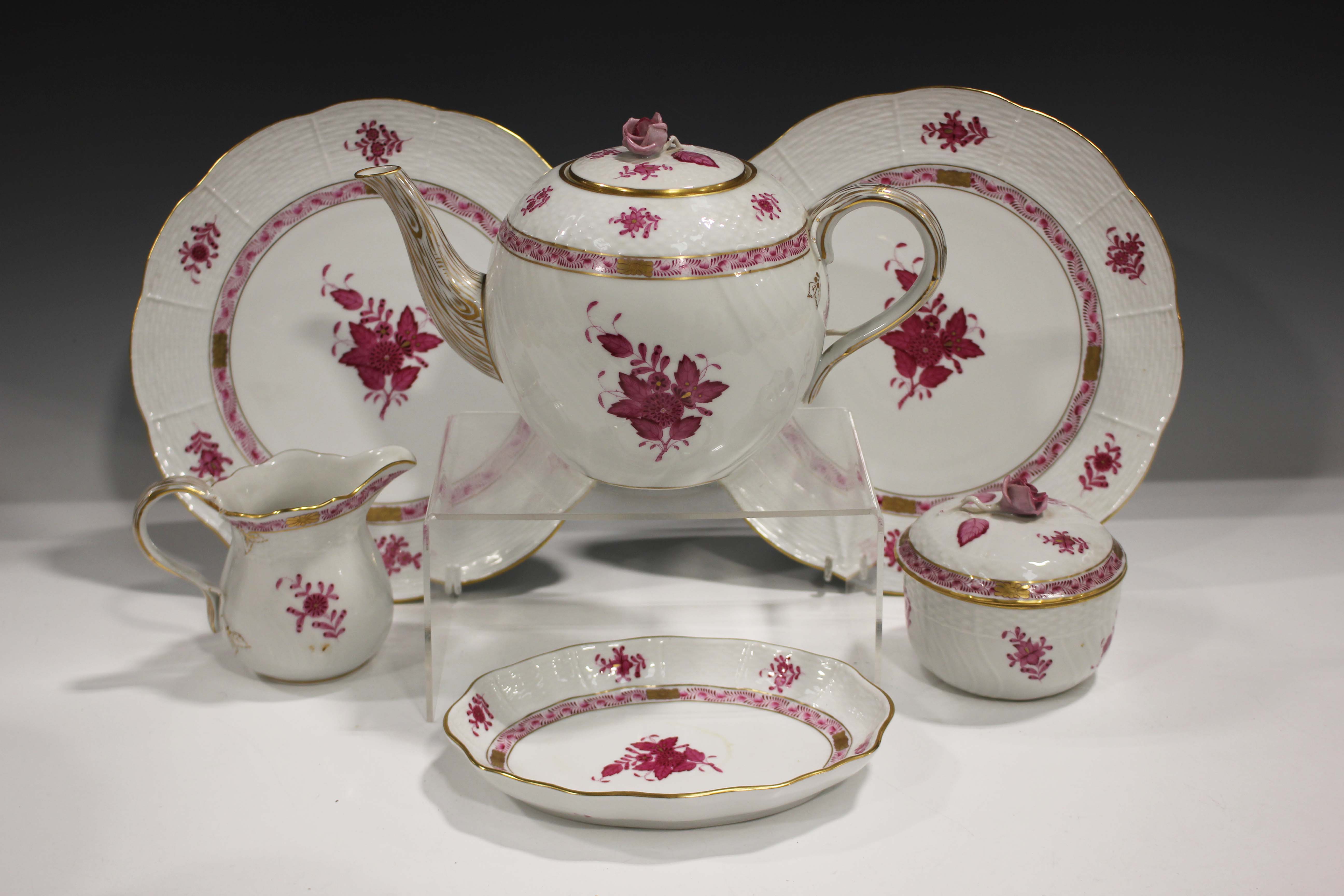 A Raspberry colourway Herend Chinese Bouquet pattern part tea and coffee service, with basketweave and rib moulded basketweave rims, comprising teapot and cover, jug, sucrier and cover, two cake plates, diameter 26cm, footed comport, small oval dish, length 19.5cm, six teacups and saucers, seven coffee cups and saucers and eight small plates, diameter 15.5cm.