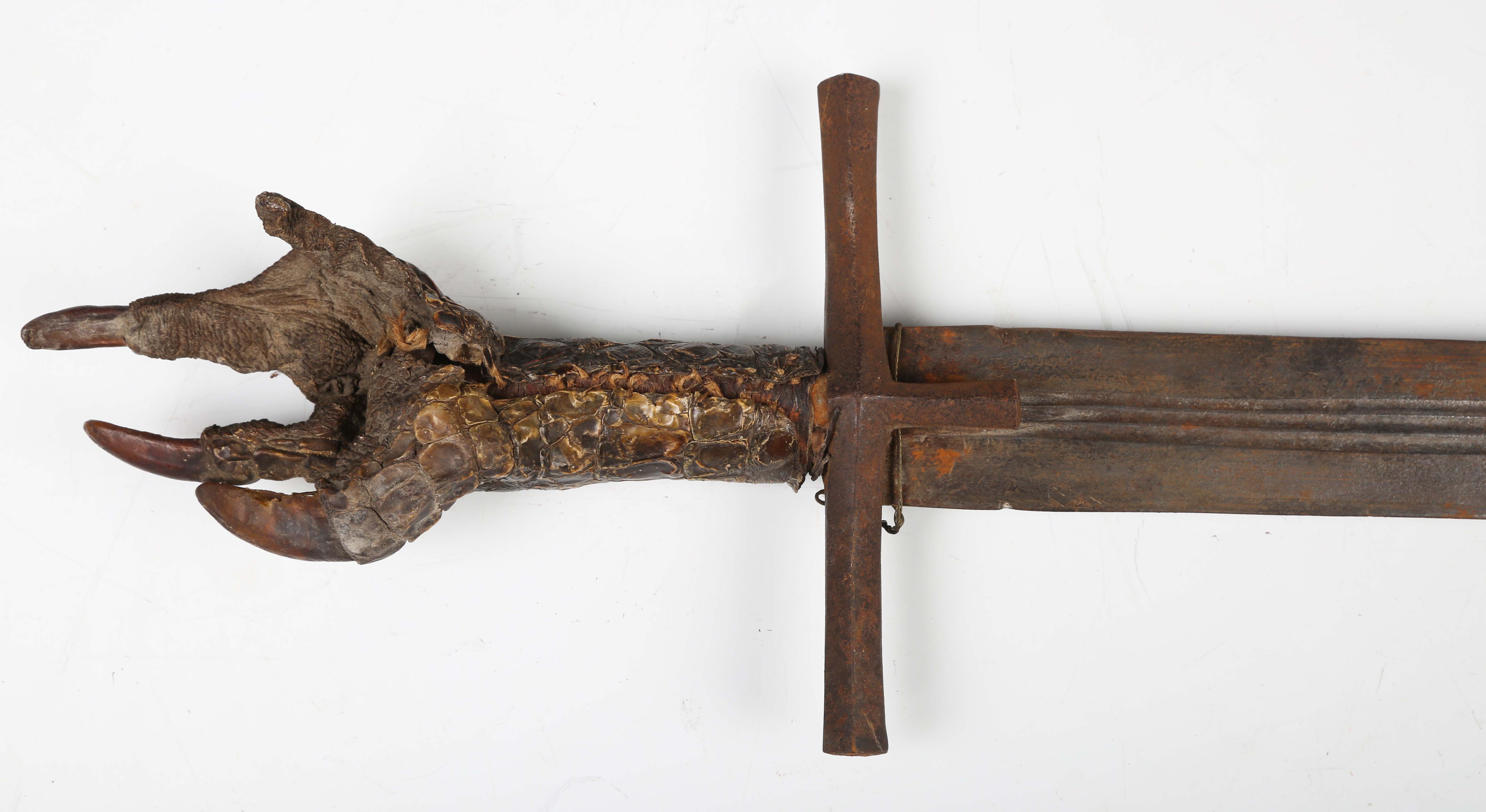 An unusual 19th century Sudanese Mahdist kaskara sword with double-edged fullered blade, blade length 93cm, and T-shaped square-section crossguard, the grip covered with a crocodilian foot, the scabbard also covered with crocodilian skin.