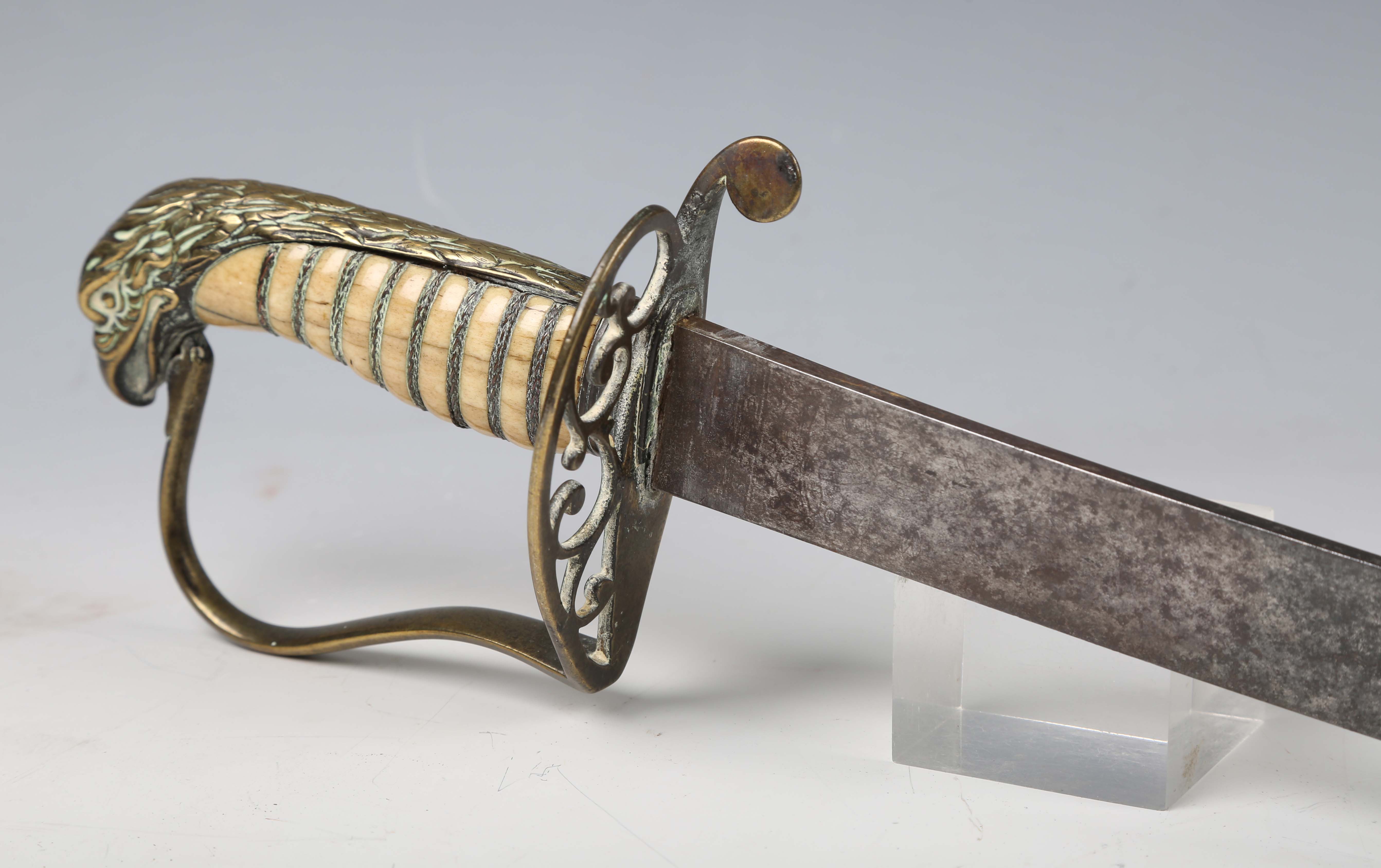 An early 19th century officer's dress sword, possibly of American origin, with curved single-edged blade, blade length 74cm, openwork guard with scroll decoration, stirrup hilt, wire-bound marine ivory grip and eagle-head pommel, with brass-mounted leather scabbard.