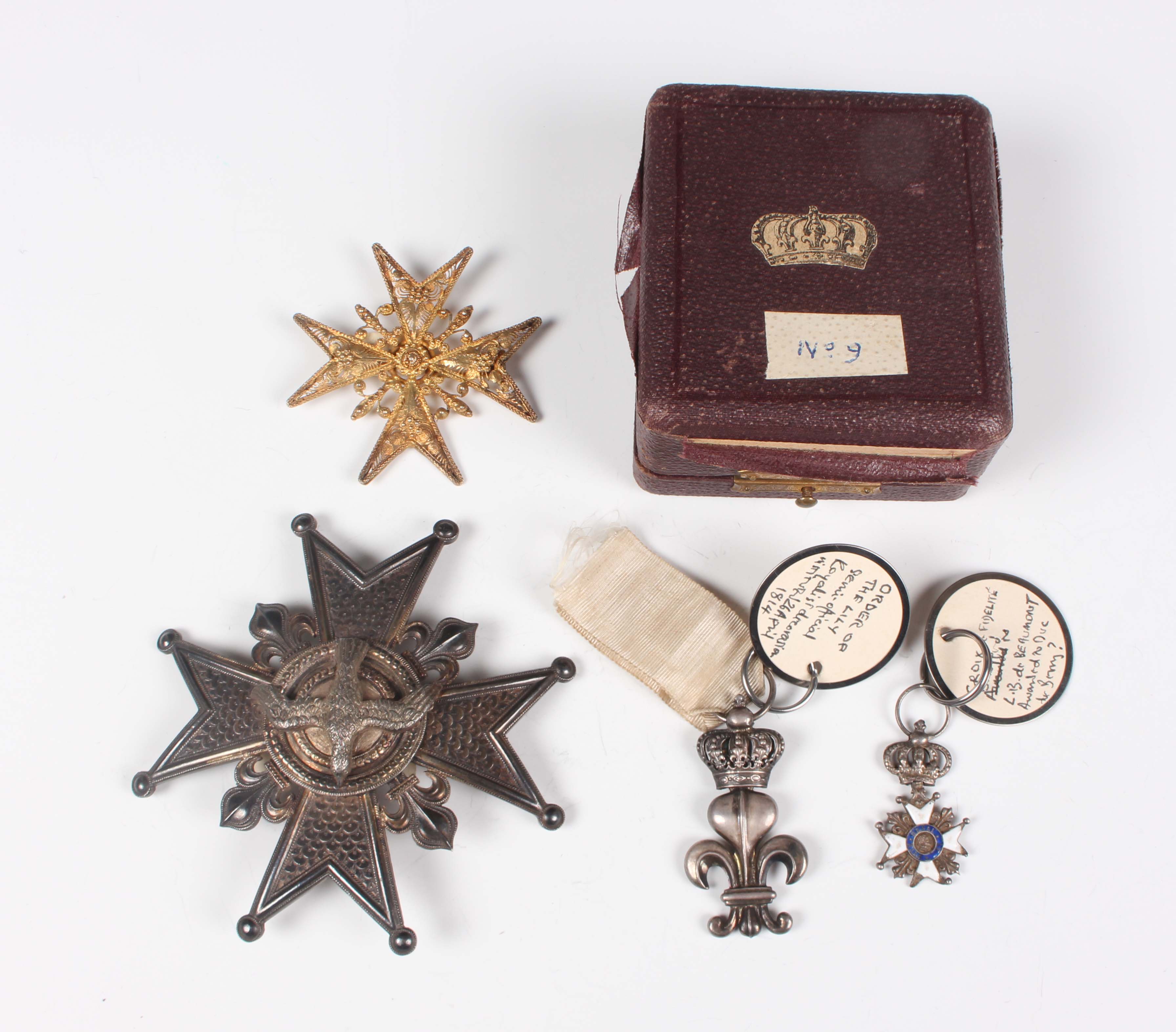 A French silver cruciform breast star of the Order of St Esprit, a French silver Decoration of the Lily, a French silver, blue and white enamelled order, detailed ‘Vive Henri IV and ‘Vive Le Roi’, and a gilt filigree cruciform brooch badge, with an associated case.