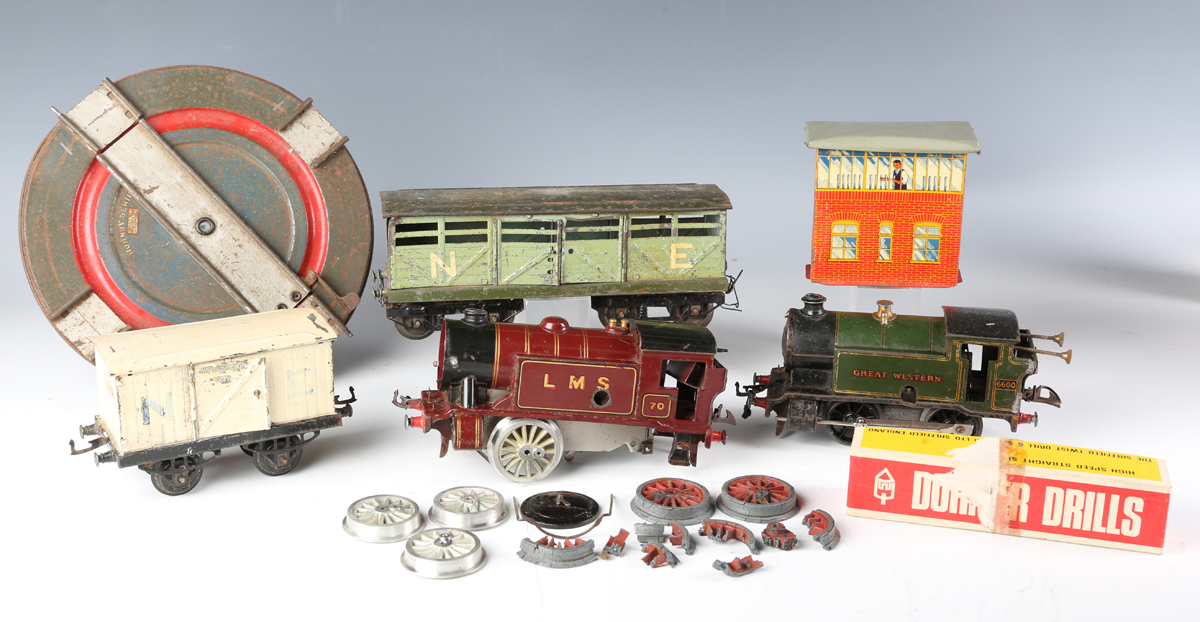 A collection of Hornby gauge O railway items, including clockwork 0-4-0 tank locomotive 6600 Great Western, tank locomotive 70 LMS (disassembled), goods wagons, coach buffers, track, points and turntable, some boxed (playwear and faults).