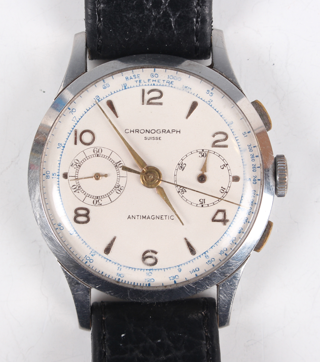 A Chronograph Suisse stainless steel circular cased gentleman's wristwatch with jewelled Landeron 51 caliber movement, the dial with gilt Arabic numerals and arrowhead hour markers, two subsidiary dials and outer tachymeter scale, case diameter 3.7cm, on a black leather strap.