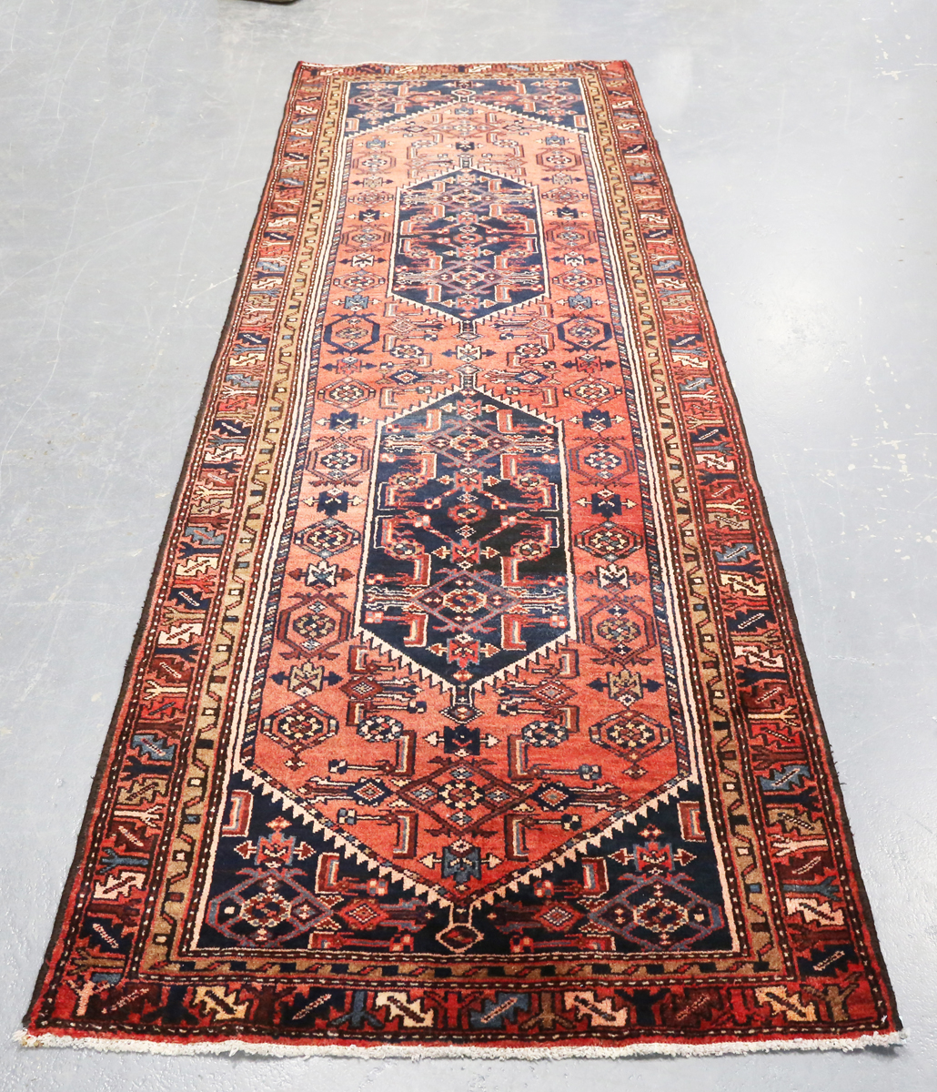A Hamadan runner, North-west Persia, mid/late 20th century, the terracotta field with two stepped reserves, within a serrated leaf border, 317cm x 112cm.