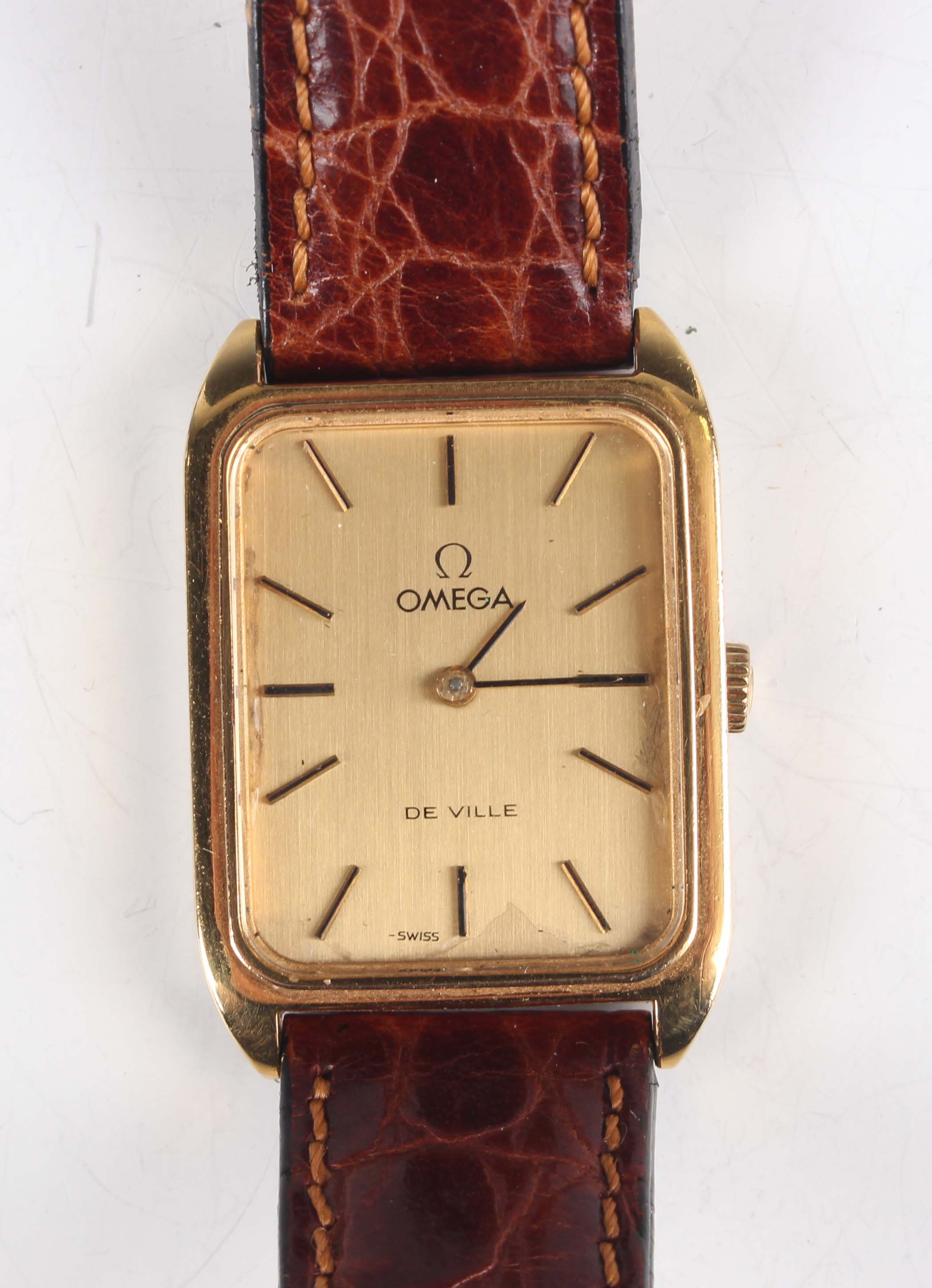 An Omega De Ville gilt metal fronted and steel backed rectangular cased wristwatch, Ref. 511.0503, circa 1972, the signed and jewelled 620 caliber movement numbered '34401075', the signed gilt dial with baton hour markers, the signed case back interior numbered '511.0503', case width 2.3cm, on a brown leather strap.