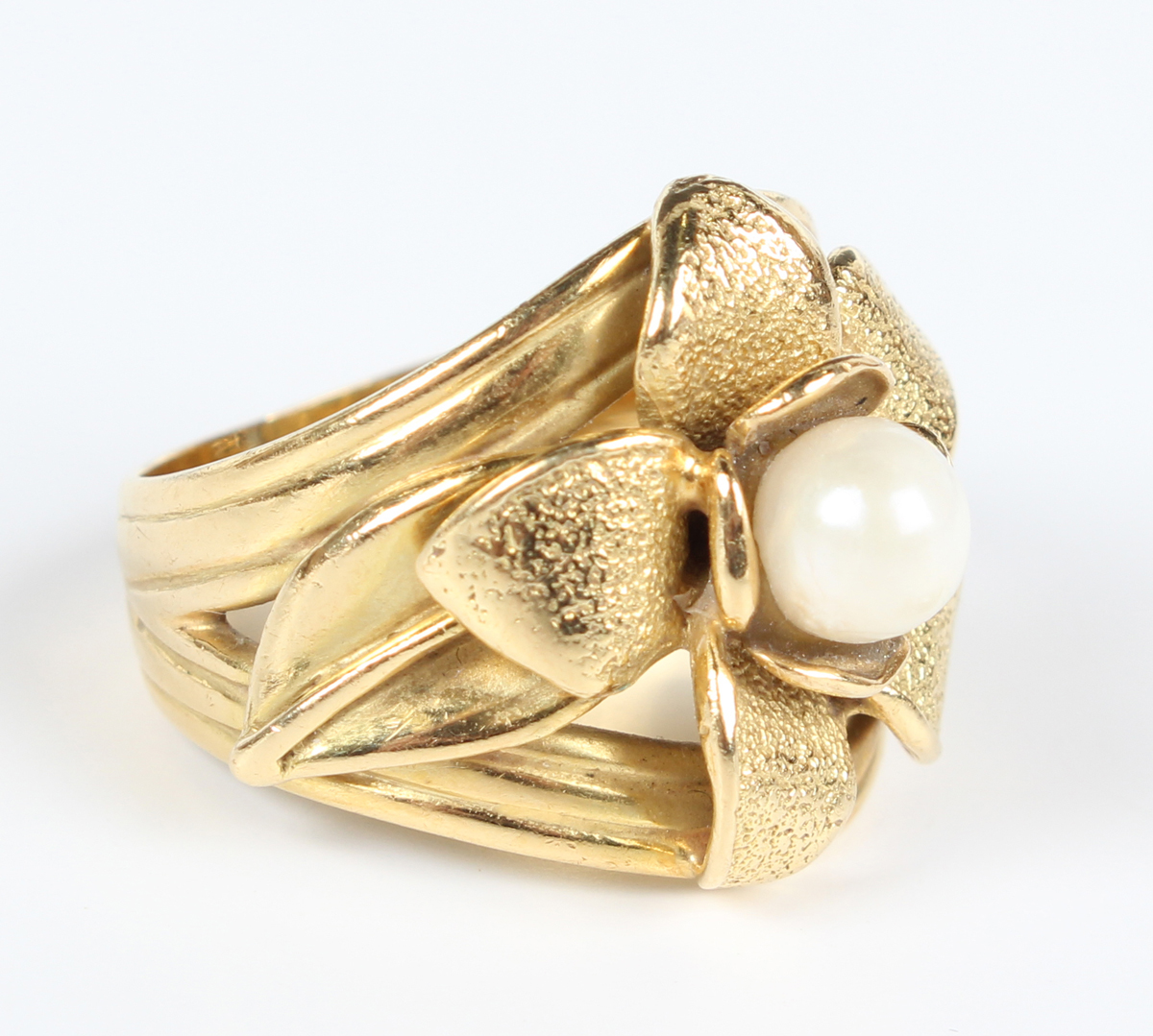 An Italian gold and cultured pearl ring in a wide band flowerhead design, mounted with a cultured pearl to the centre, detailed '750', weight 9.6g, ring size approx N.