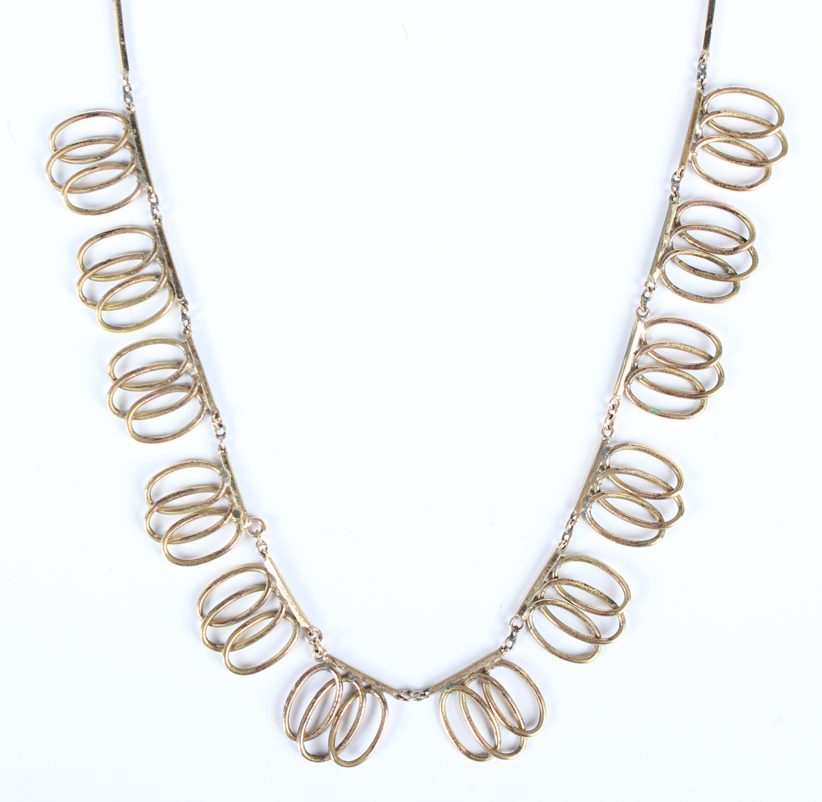 A gold fringe necklace, the front with triple interlinked ovals on a bar link chain with boltring clasp, detailed '9K', weight 9.8g, length 39.4cm.