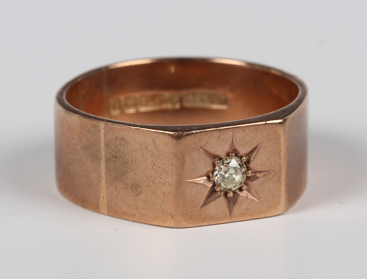 A 9ct gold ring, star gypsy set with a cushion shaped diamond, Birmingham 1922, weight 7g, ring size approx T.