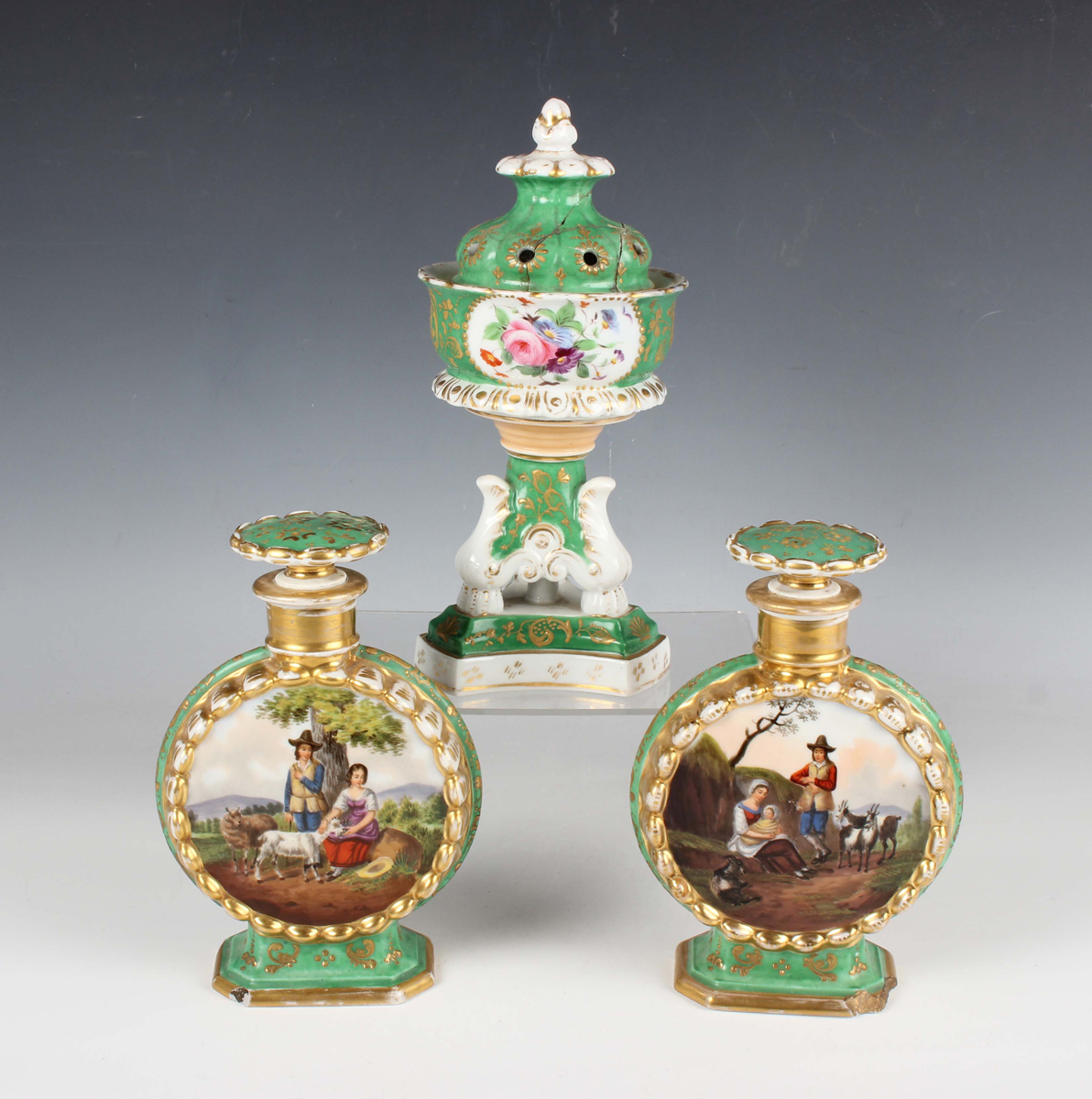 A pair of Paris porcelain vases or scent bottles and stoppers, circa 1840, of flattened circular shape, painted with country folk and animals opposing floral arrangements, both within moulded gilt framing against a green ground overlaid with gilt scrollwork, incised numerals to bases, height 18.5cm (minor faults), together with a Paris porcelain green ground pastille burner and cover, unmarked, height 24cm (cover extensively repaired).