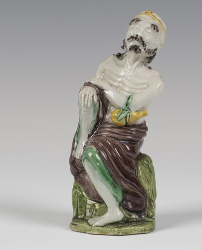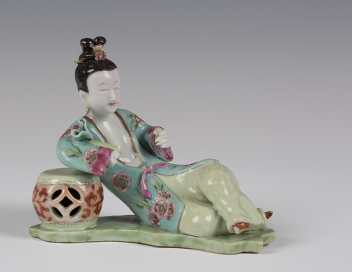 A pair of Chinese famille rose enamelled export porcelain figure groups of seated maidens with spaniels and phoenixes, early Qianlong period, each seated maiden wearing a blue turban, green coat with lotus roundels, pink belt and iron red pantaloons, holding a spaniel beside a phoenix and rocks, on a turquoise and brown washed flat rocky base, heights 21.5cm (fitted with gilt brass candle holders and drip pans, minor faults and restoration). Note: the phoenix, or fenghuang, was the Empress of Birds in Chinese mythology; it signifies beauty, grace, virtue and the unity of yin and yang. A similar pair of figures with detailed discussion is illustrated by William R. Sargent in 'The Copeland Collection: Chinese and Japanese Ceramic Figures', The Peabody Museum of Salem, 1991, pages 124-127.