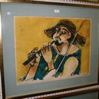 Serge Shart - Study of a Bucolic Man playing Pipes, mid-20th Century lithograph printed in colour, signed, dedicated, inscribed 'Paris' and dated '20.III.72', signed and further inscribed, together with another lithograph, Study of a Female Street Vendor holding a Basket of Fruit, both within blue canvas mounts and gilt frames.
